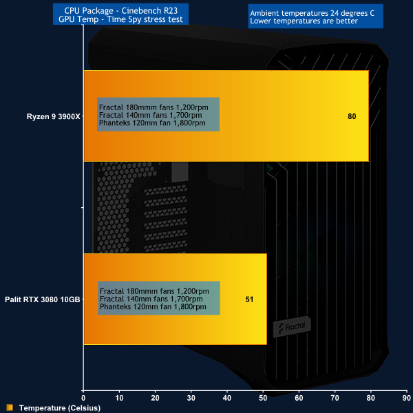 We pummelled the test PC with a combination of Cinebench R23 and Time Spy Stress Test which drew 500W at the wall socket. The temperature of our Ryzen 9 3900X remained just below 80 degrees C while the RTX 3080 graphics card ran at an icy 51 degrees C.