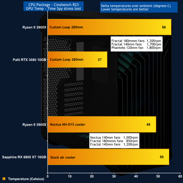 Bearing in mind that our custom loop used a tiddly 280mm radiator to cool both the CPU and GPU in a combined loop, we were pleasantly surprised to see our figures stood up well in this second round of testing. The Noctua NH-D15 did a fine job cooling our Ryzen 9 3900X while the Sapphire RX 6800 XT was clearly working well in the Torrent case. In our original review we were confident that Torrent has good air flow and we stand by that judgement,