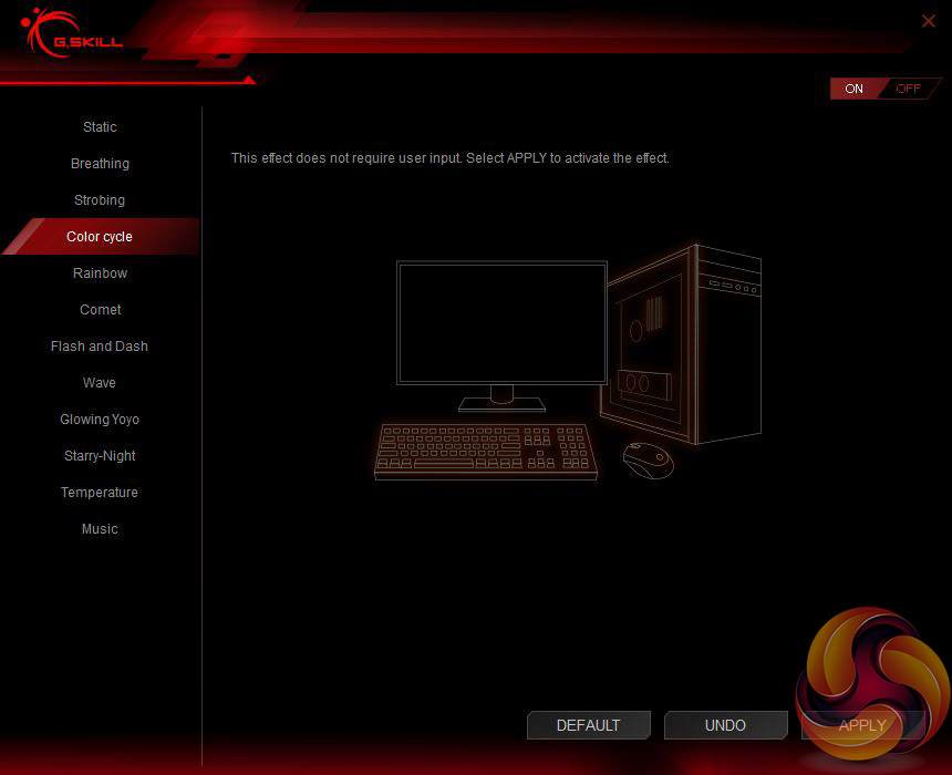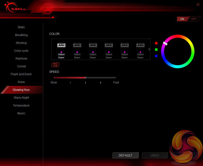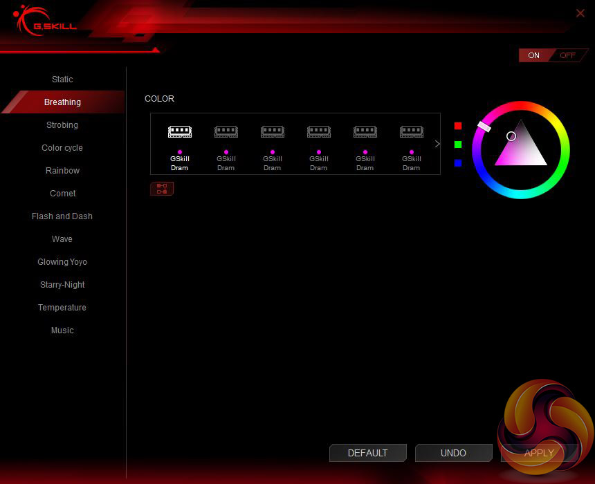 The next step is installing the G.Skill control utility which is currently in Beta. The interface uses the same layout as the Asus AURA control software and offers you a list of modes; Static, Breathing, Strobing, Colour Cycle, Rainbow, Comet, Flash and Dash, Wave, Glowing Yoyo, Starry Night, Temperature and Music.