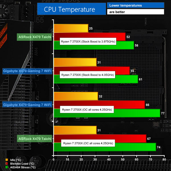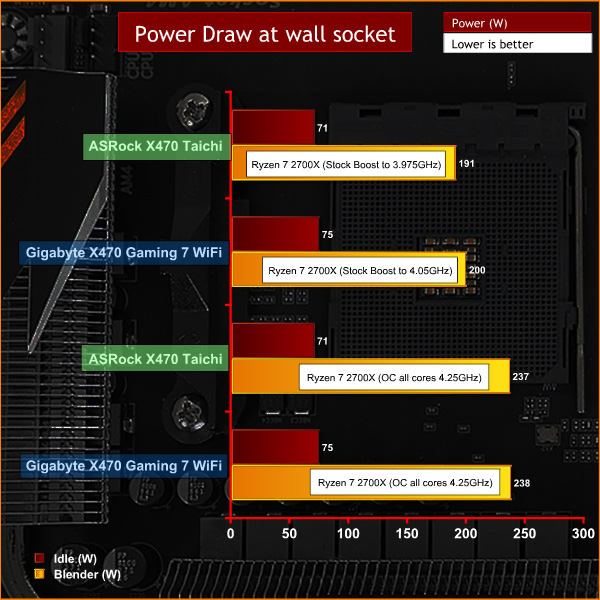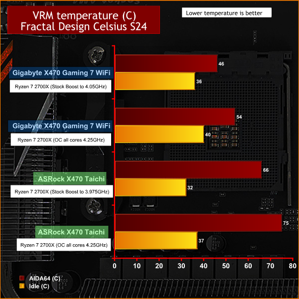 Power draw at the wall socket was exactly in line with other X470 motherboards and so too were CPU temperatures both at stock clocks and overclocked speeds. VRM temperatures, on the other hand, were lovely and low around the 50 degrees Celsius mark. That’s a long way inside the safe limits of the hardware, which makes us very happy.