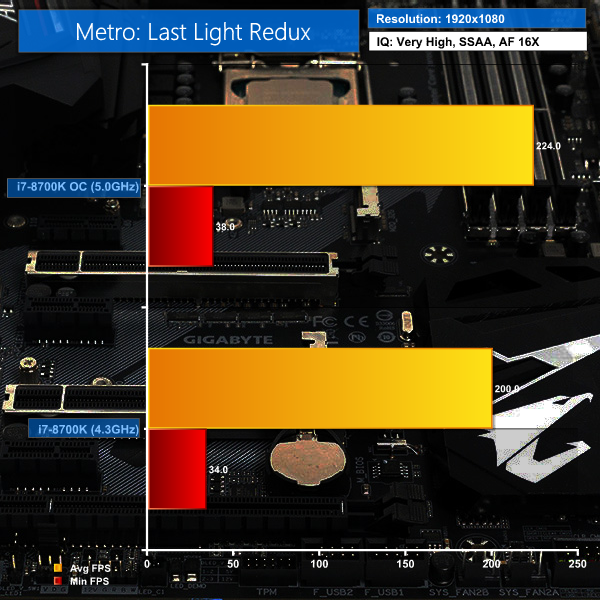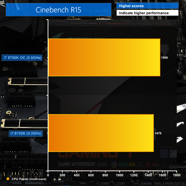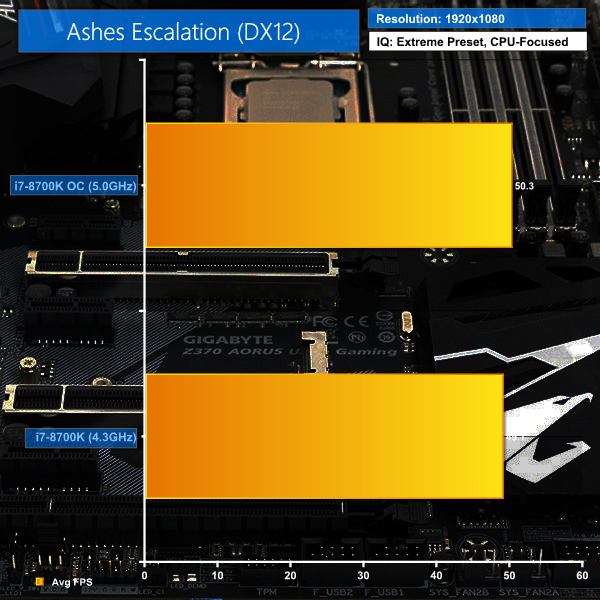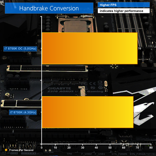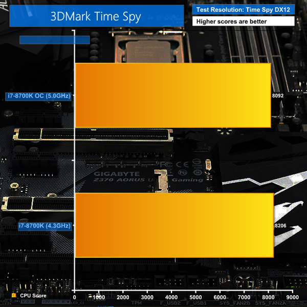 Testing the Z370 Aorus Ultra Gaming at stock clock speeds with an all core Turbo of 4.3GHz went smoothly and the board compared favourably with the Z370 Aorus Gaming 7. It was noteworthy that synthetic test results were slightly higher for the Ultra Gaming while the Gaming 7 pulled ahead in gaming benchmarks, however the two motherboards were not tested at the same time so it would be rash to draw too many conclusions.