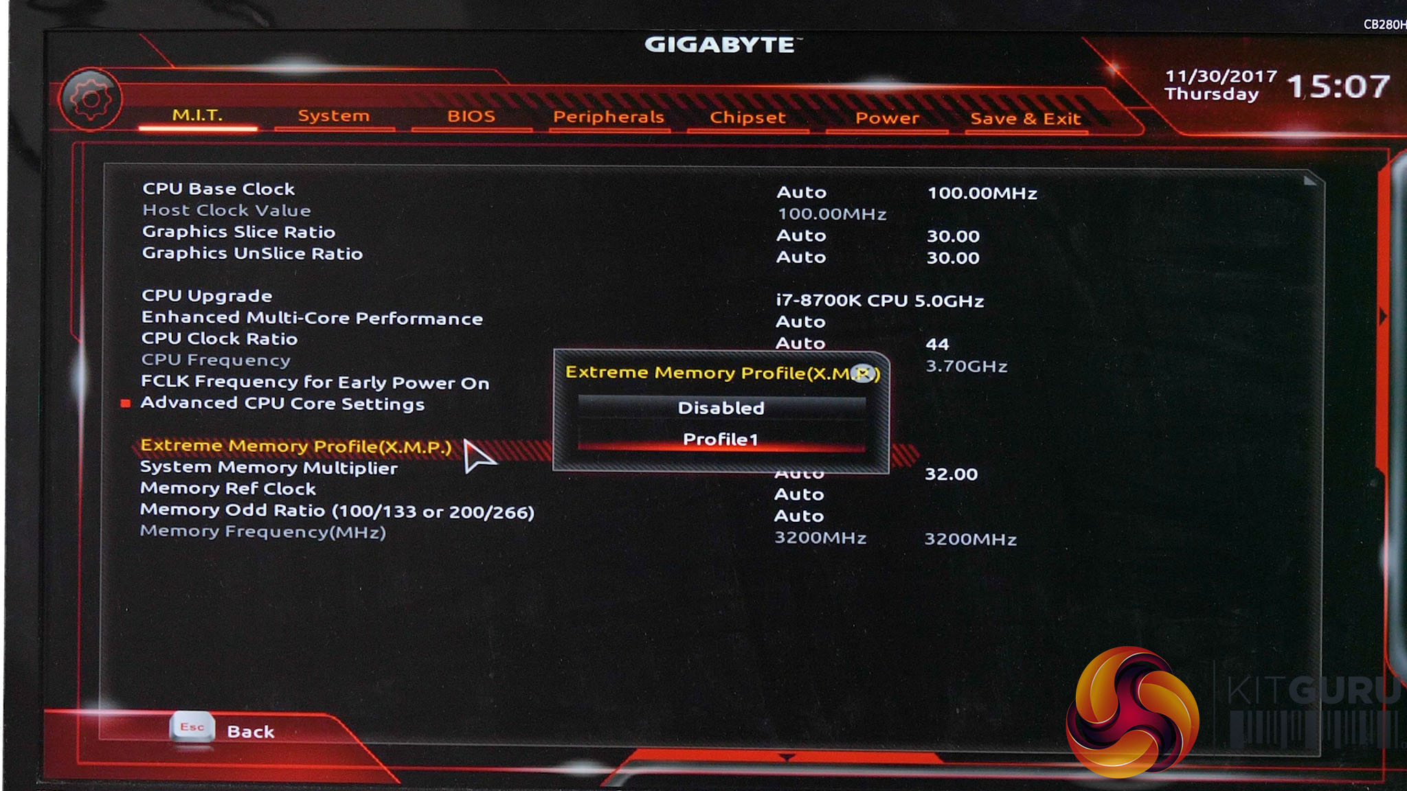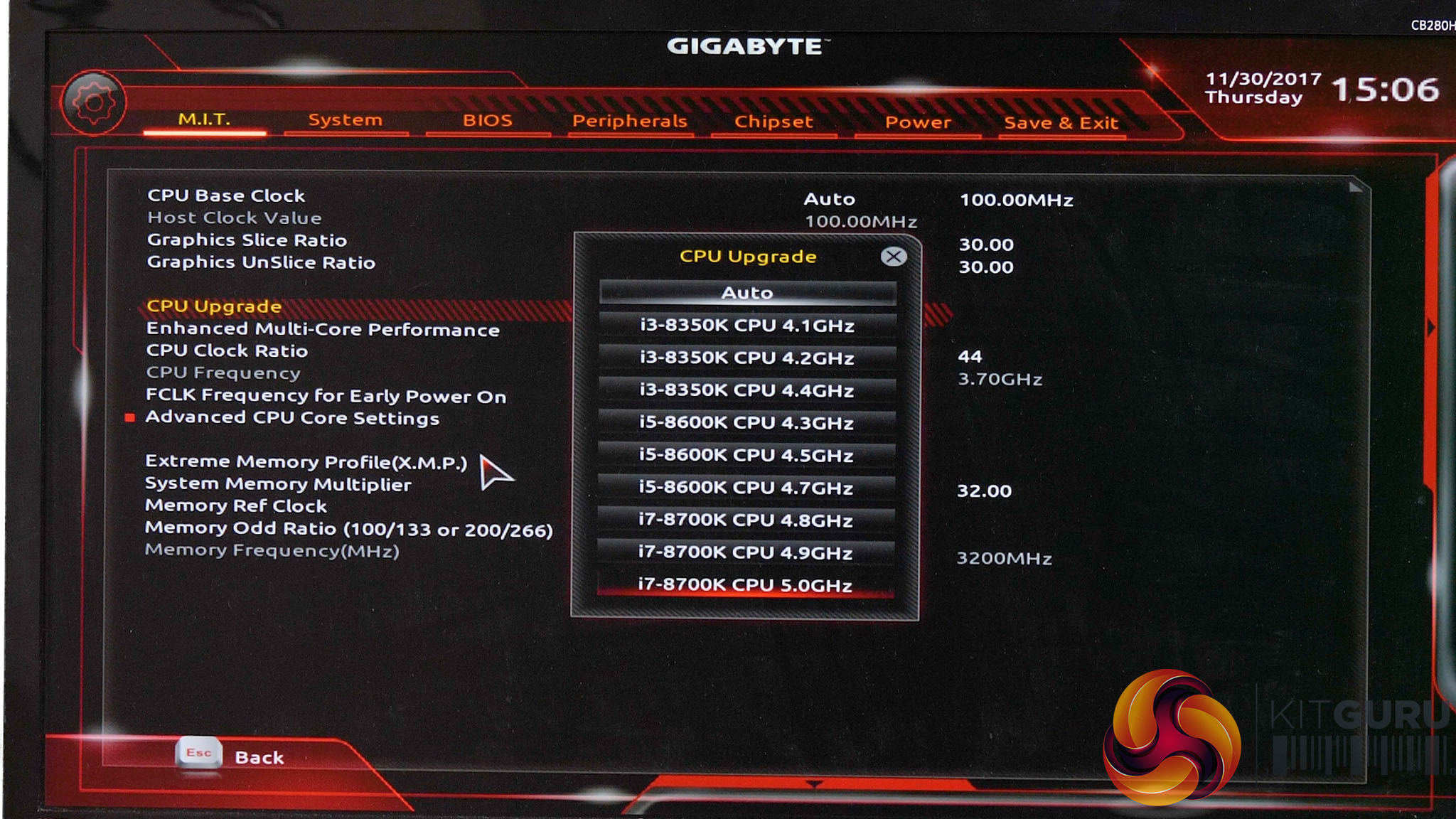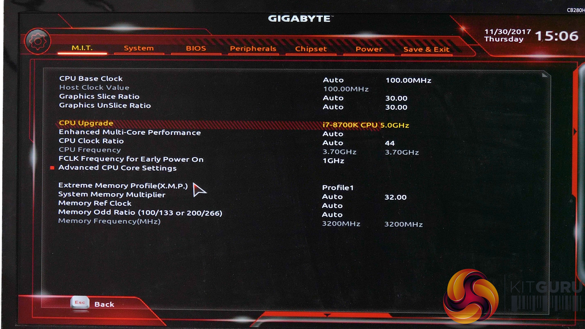 Overclocking the Ultra Gaming from 4.3GHz to 5.0GHz was simple using the preset profile in the UEFI. This raised the core voltage from 1.15V (the same as Z370 Aorus Gaming 7) to 1.35V, where the overclocked Gaming 7 was set at 1.4V.