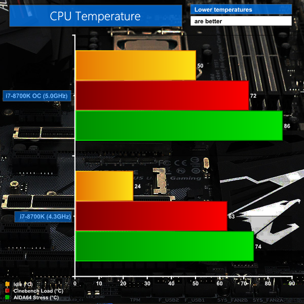 The idle temperature for our overclocked Core i7-8700K was much higher on the Ultra Gaming at 50 degrees than the Gaming 7 or, indeed, any other Intel CPU we recall in recent times. HWMonitor confirmed the CPU wasn't pull a workload in the background when it was supposed to be idling, and we have no explanation for this behaviour. When the Gaming Ultra was running the CPU flat out at 5.0GHz the CPU temperature in Cinebench was 72 degrees which, if anything, is on the low side so the CPU cooler was clearly working correctly.