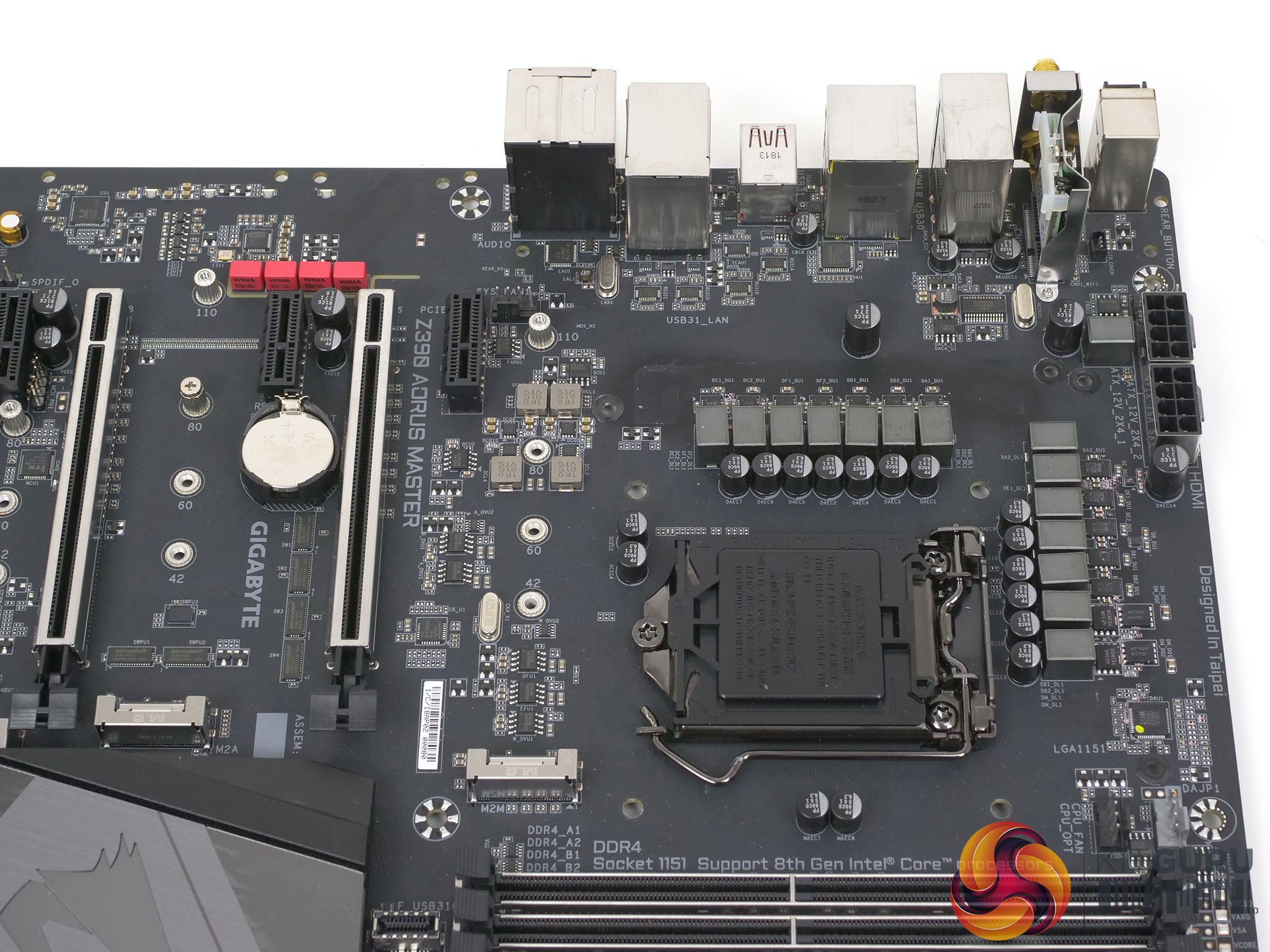 Gigabyte describes the Z390 Aorus Master as ‘Designed for All Core 5GHz+’, and while that claim would likely be made for many enthusiast Z390 boards on the market, in this instance we can see the evidence in front of our eyes. The VRMs for power delivery use International Rectifier hardware throughout with an 8-phase IR35201 controller that drives 12-phases of Vcore and two phases to handle the iGPU. The controller works through six IR3599 phase doublers that drive 12 IR3553 40A MOSFETs, which means the Z390 Aorus Master can deliver a maximum of 480A to the CPU with 85 percent efficiency.