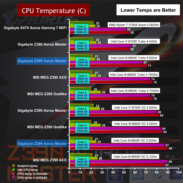 At stock clock speeds the Gigabyte Z390 Aorus Master exhibits impressively low CPU temperatures however when we overclocked to 5.0GHz the Gigabyte ran a few degrees warmer than the MSI Z390 Godlike. That was despite using the same CPU voltage and drawing less power than the MSI board and while the difference was slight it was consistent.