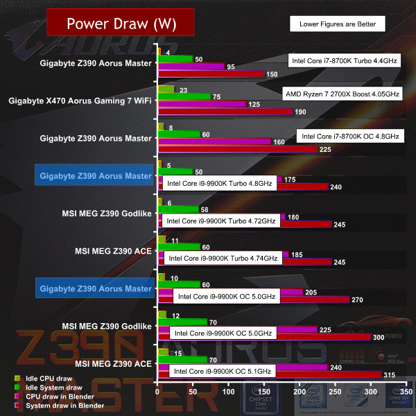 The Gigabyte Z390 Aorus Master draws less power than both the MSI MEG Z390 Godlike and the MEG Z390 ACE, which is both unexpected and impressive as we were using the same voltage settings.