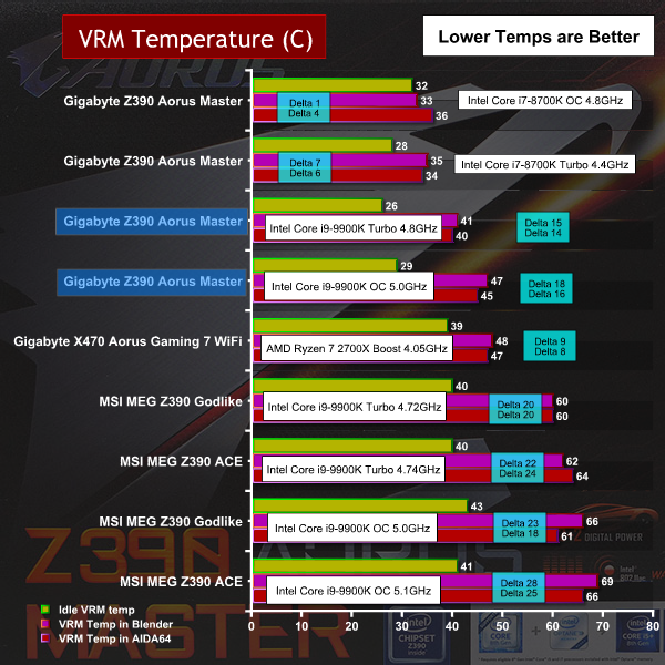 VRM temperatures were a completely different story as the Z390 Aorus Master is amazingly cool under load and beats out other comparable motherboards by some 20 degrees. It was interesting to see how this motherboard behaved when we tested with a Core i7-8700K that draws only slightly less power than the i9-9900K, where we saw the VRM temperatures drop even lower to the tune of five degrees. The power delivery hardware on this motherboard is absolutely top notch.