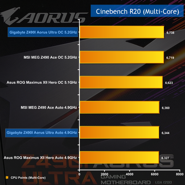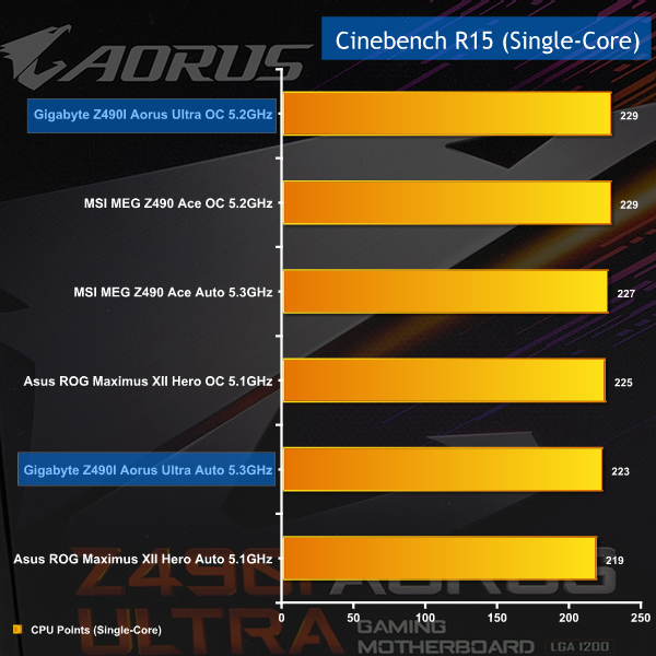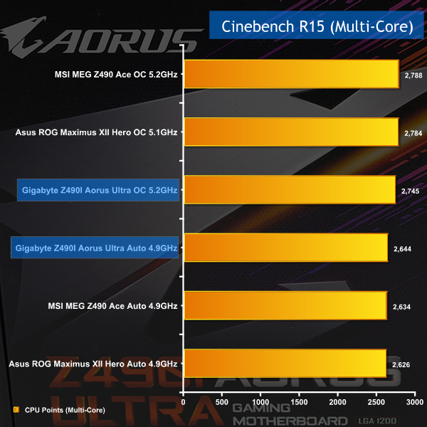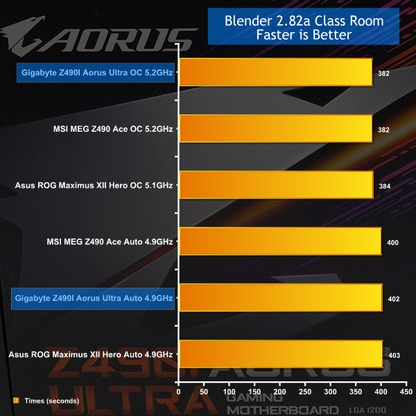 In Blender 2.82a the Gigabyte ties for honours with MSI as both motherboards can sustain an overclocked speed of 5.2GHz on our Core i9-10900K.