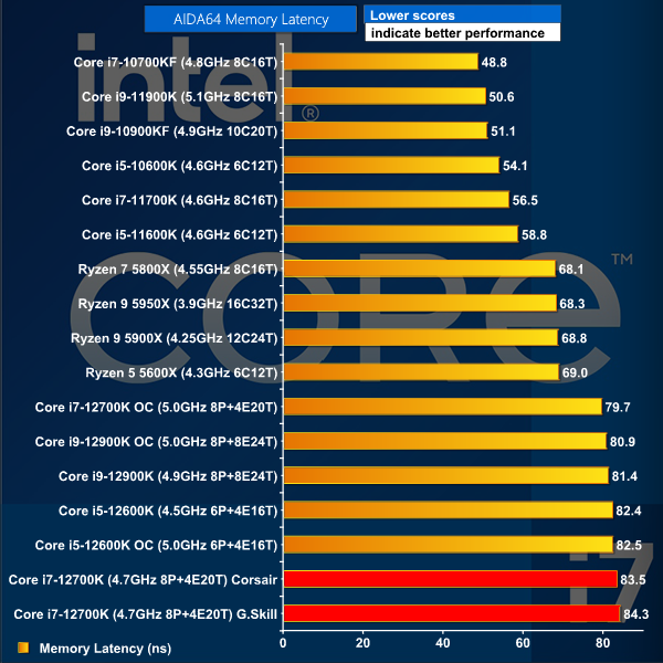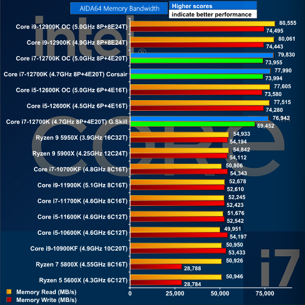 In AIDA64 the Core i7-12700K performs well, however we can see the G.Skill carries a slight penalty compared to Corsair Vengeance.