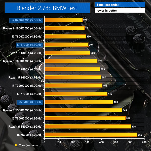 We don't really expect Core i7 and Core i5 dekstop CPUs to be used for multimedia work such as Blender or Adobe Premiere, but wanted to see whether the Core i7-8700K was a gaming CPU or more of an all-rounder. Holy heck, that thing performs, storming to the top of the chart and embarrassing Ryzen 7 1800X and Core i7-7800X.