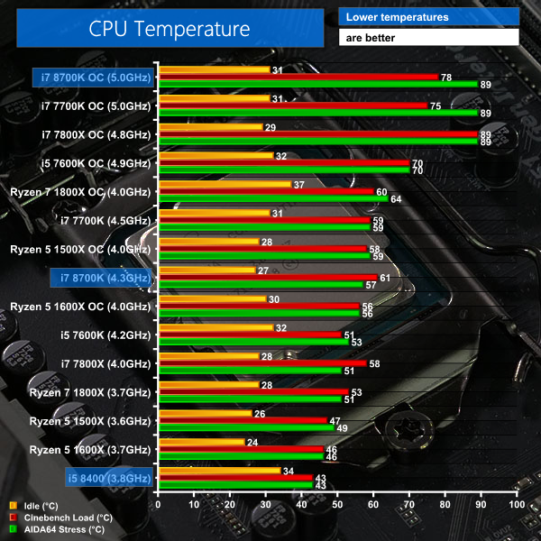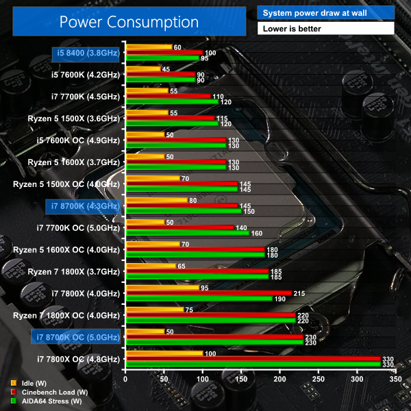 Those extra cores in i7-8700K demand a fair amount of extra juice, compared to i7-7700K. There is nothing alarming to report but if you run six cores at high speed you need to feed them almost as much power as the Ryzen 7 1800X.