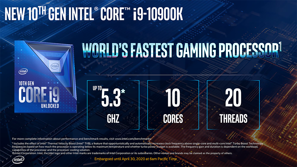 Intel's 10th Gen Comet Lake-S family of CPUs is headlined by the Core i9-10900K which sports 10 cores and 20 threads along with a clock speed ‘Up to 5.3GHz', using a new feature called Thermal Velocity Boost. When you consider this CPU continues to use the trusty 14nm++ fabrication process and Skylake architecture, we were curious to see whether the Core i9-10900K would catch fire or would simply melt. Spoiler alert: no CPUs were harmed in the making of our video.