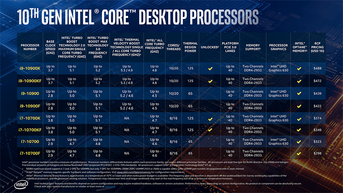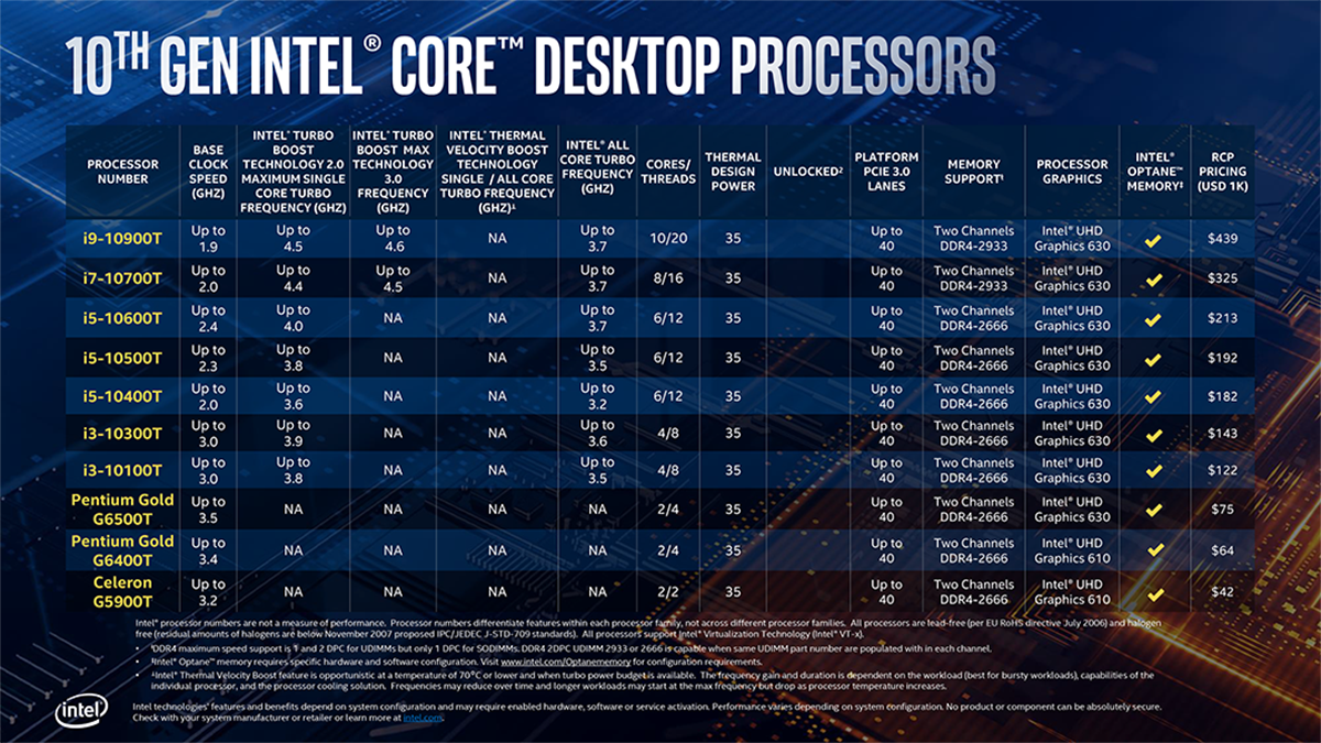 Intel's 10th Gen Comet Lake-S product stack is extensive and includes SKUs with a range of two to ten cores and TDPs of 35W, 58W, 65W and 125W, however the notable part of the specifications is the fact that Intel has applied Hyper Threading to the vast majority of the parts. This is very good news as Hyper Threading was disabled for the Core i7-9700 and Core i5-9600 and we are very pleased to see this feature return for 10th Gen.