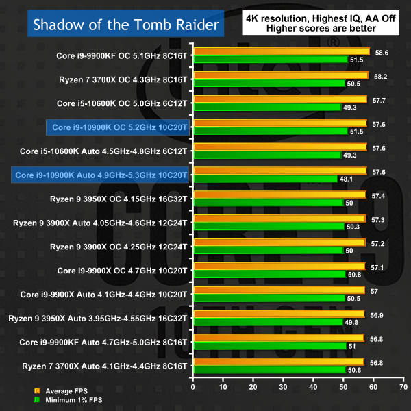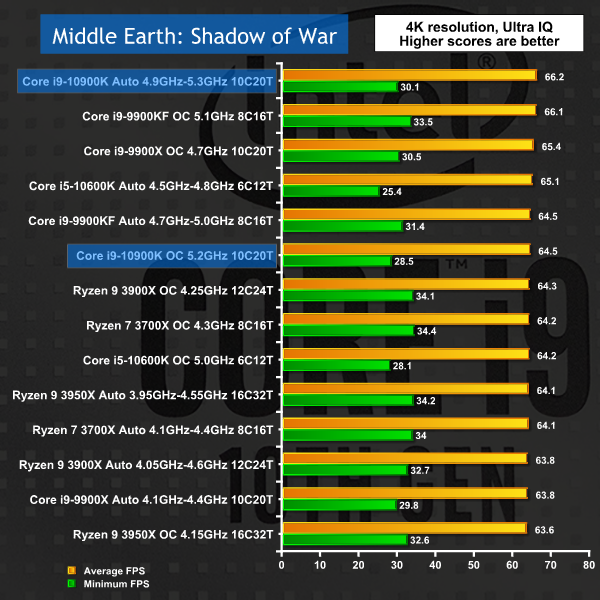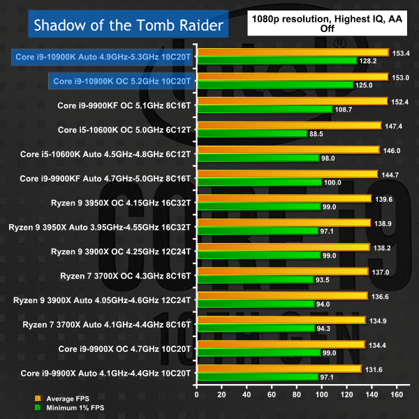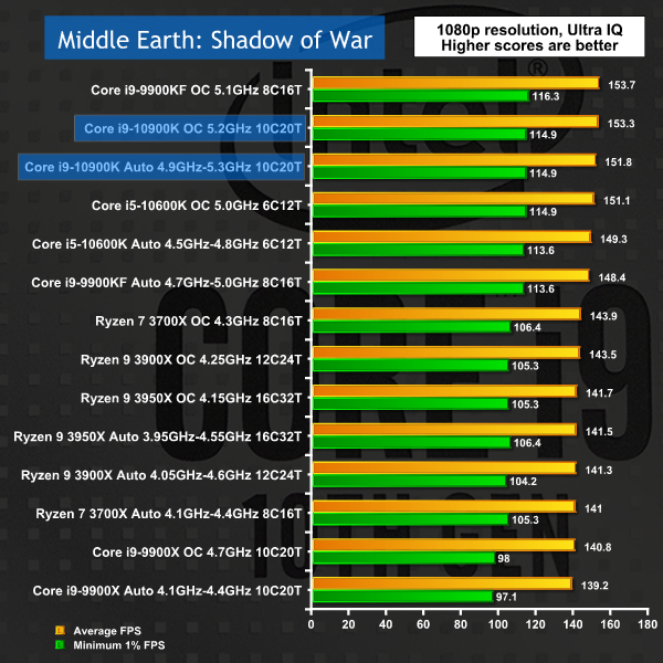 Once again, in 1080p gaming Intel crowds out the top of the charts. Extra cores and higher clocks speeds have a clear benefit in raising minimum frame rates however you will struggle to see any differences by eye.