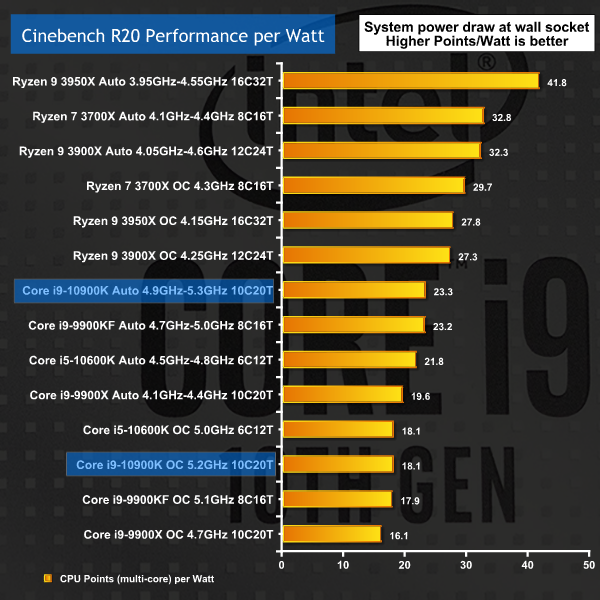 Dividing the Cinebench R20 score by the system power draw in Watts demonstrates a number of points; Zen 2 is very efficient and Ryzen 9 3950X clearly uses high quality silicon while 3900X gets poorer quality chips. Skylake efficiency is much more equal, so it is simply a matter of choosing the number of cores and the operating clock speed and then suffering the hit of the power draw.
