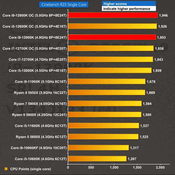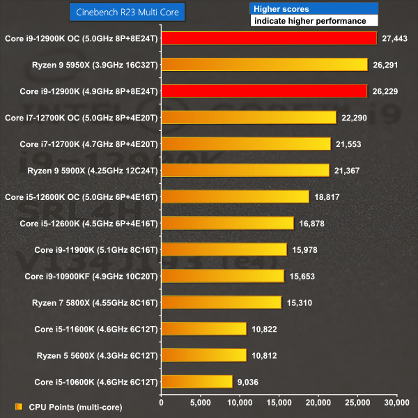 In Cinebench R23 the new Core i9-12900K takes the fight to AMD Ryzen 9 5950X. Despite using a lower number of cores Intel is practically in a dead heat with AMD.