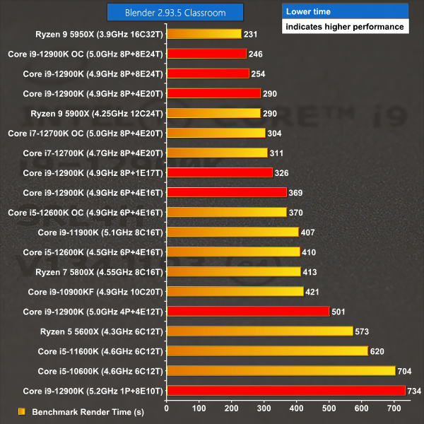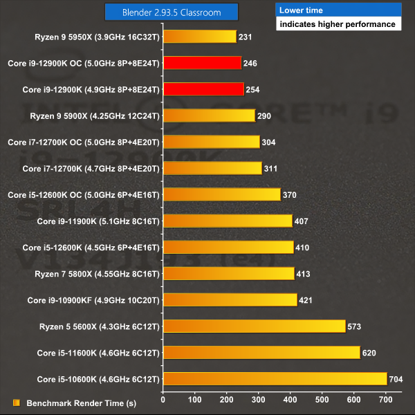 In Blender the mighty Ryzen 9 5950X holds on to its crown however it is clear that Intel has made significant steps forward and is challenging for the lead.