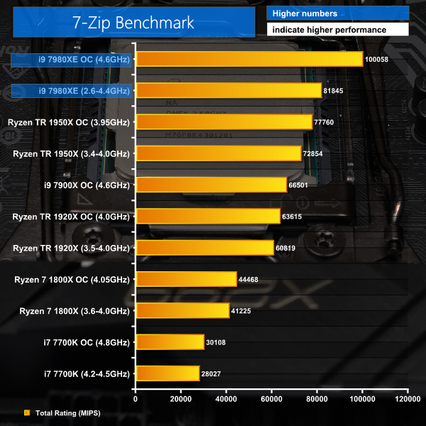7-Zip is an open source Windows utility for manipulating archives. We measure the Total Rating performance using the built-in benchmark tool. The test stresses all CPU cores to 100% and shows an affinity for memory bandwidth.