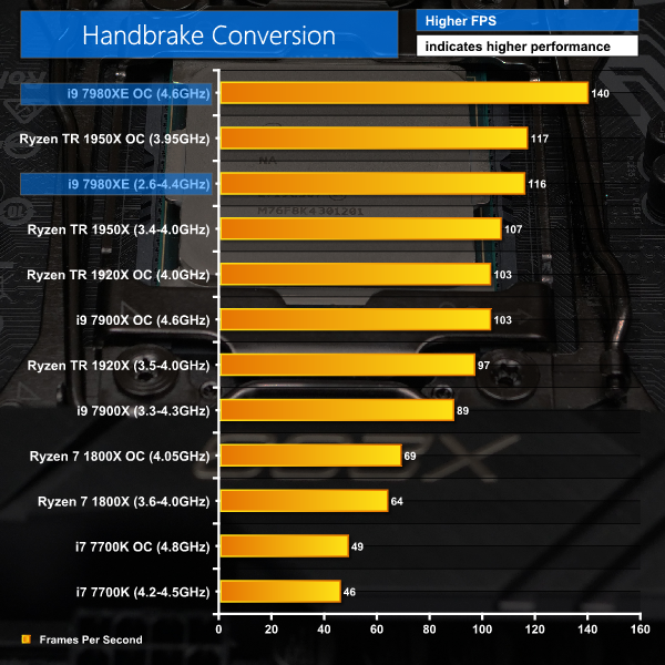 Handbrake is a free and open-source video transcoding tool that can be used to convert video files between different codecs, formats and resolutions. We measured the average frame rate achieved for a task of converting a 6.27GB 4K video using the Normal Profile setting and MP4 container. The test stresses all CPU cores to 100% and shows an affinity for memory bandwidth.