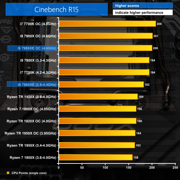 If you look at performance per core in Cinebench single thread we can see Kaby Lake i7-7700K continues to hold the crown with its superior clock speed however the i9-7980XE kicks Threadripper all over the park.