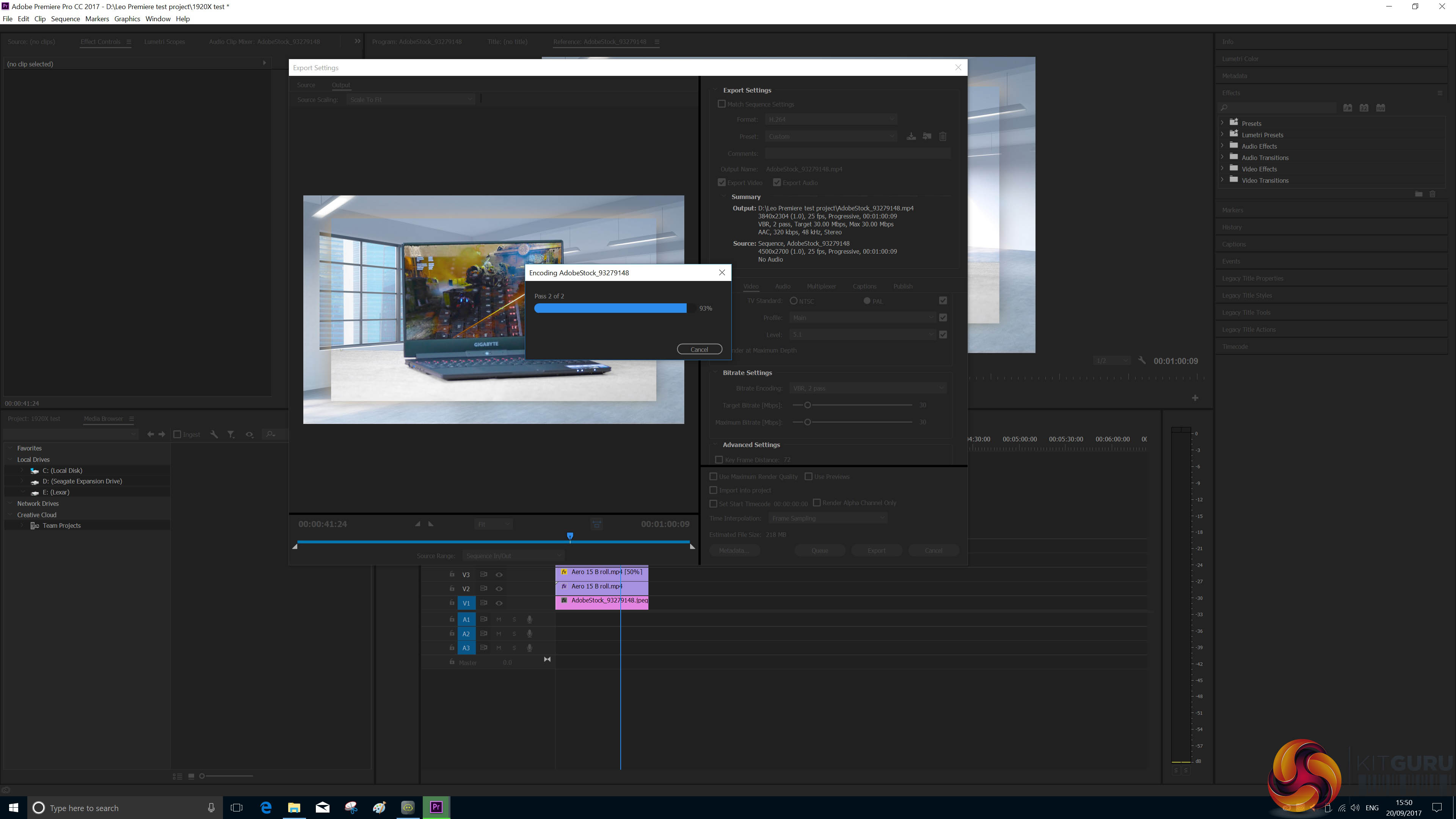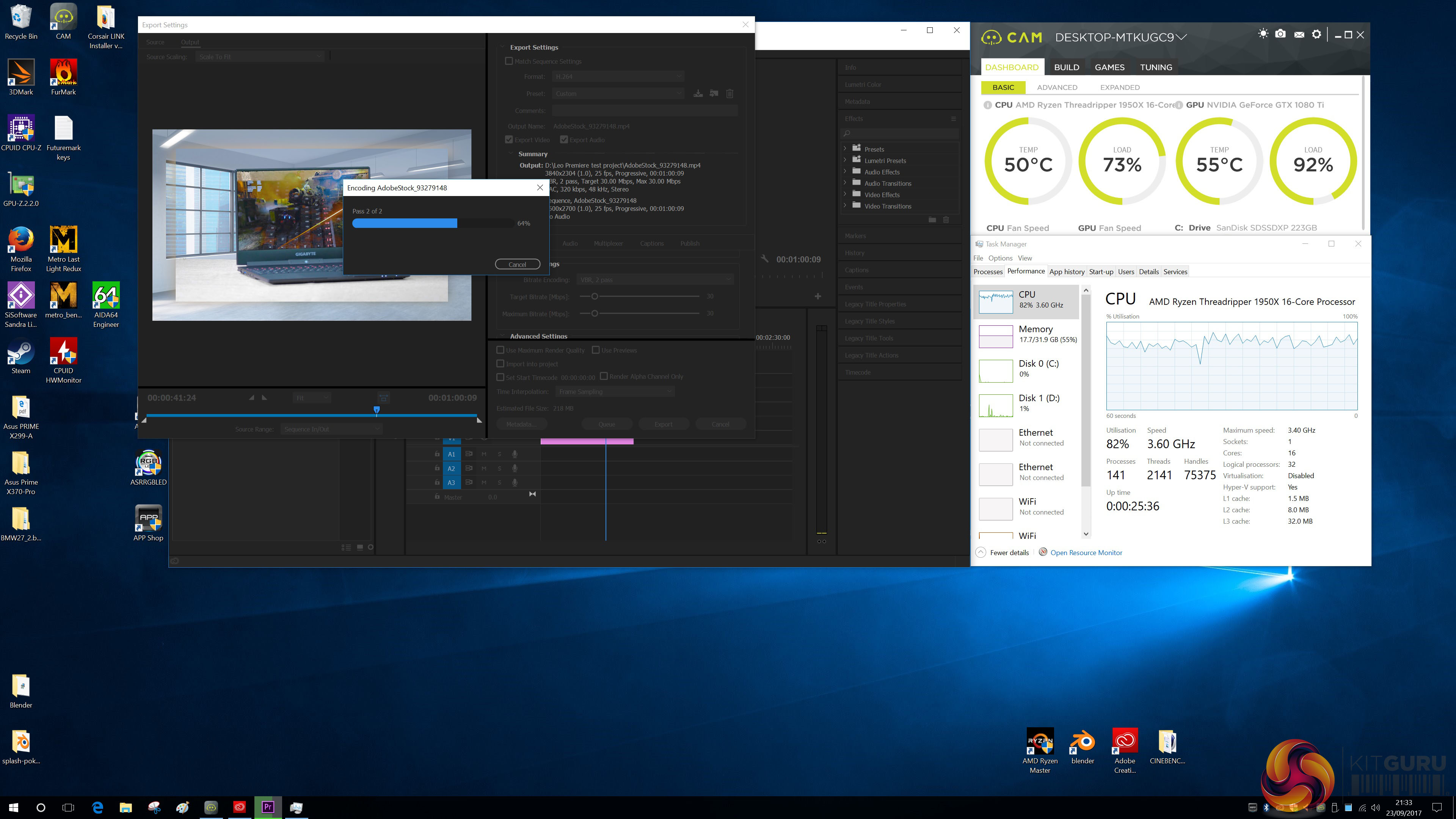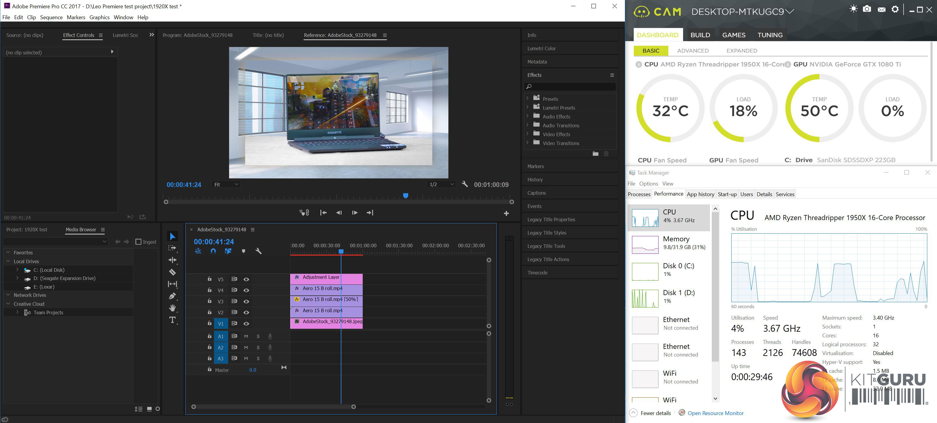 AMD Ryzen Threadripper 1950X running Premiere at Stock Clock speeds.