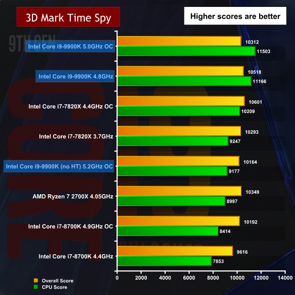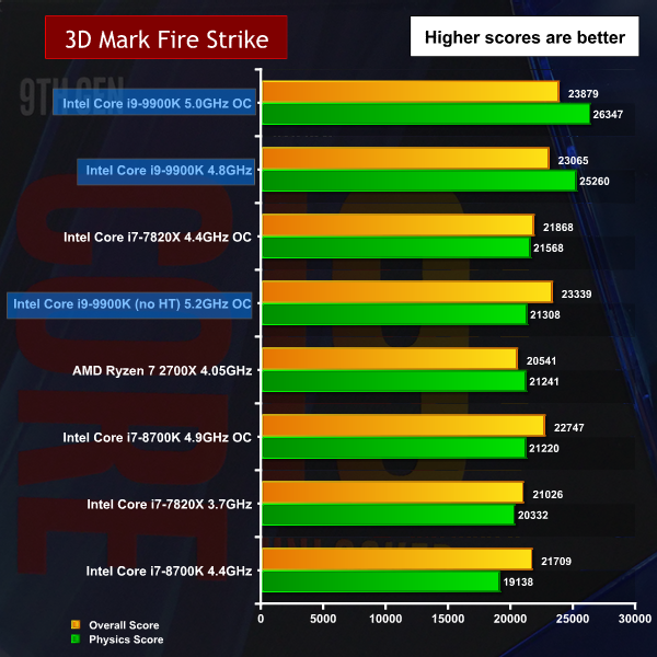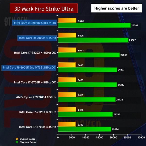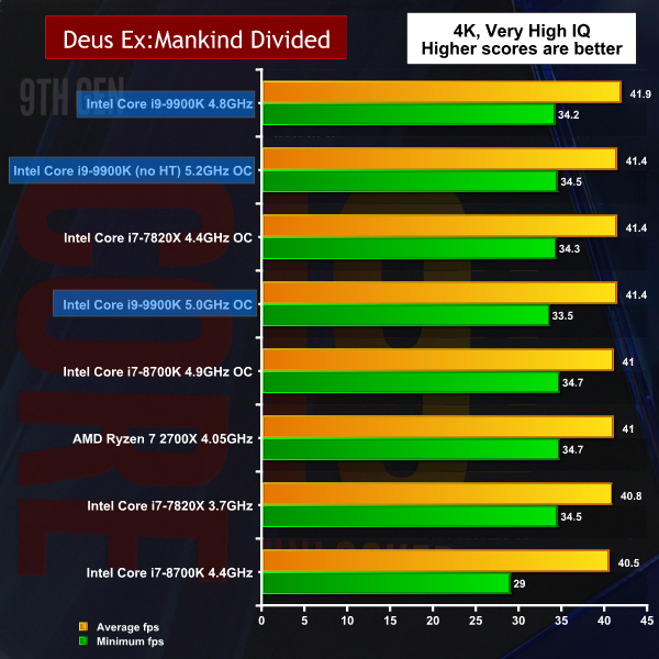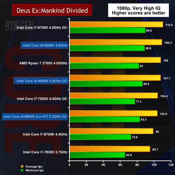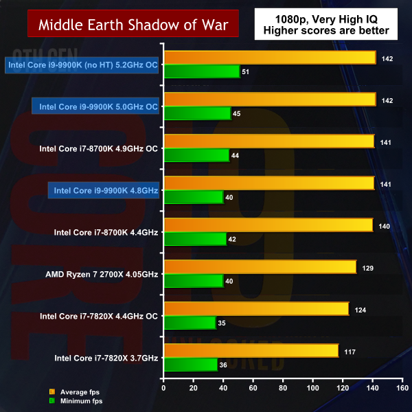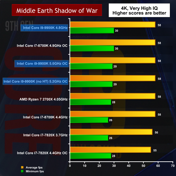 In October 2017 we raved about Intel Core i7-8700K and the watershed move from the quad core 7th Gen to the 8th Gen i7-8700K that came packed with six cores. In our conclusion we said “Core i7-8700K is fabulous and performs like a champ ... It is painful to consider that if Intel soldered the package and allowed it to cool properly that we would be able to move to a new era of PC gaming.” And here we are 12 months later with the launch of Intel’s 9th Gen Core i9-9900K that boasts eight cores, a soldered heat spreader and a maximum Turbo Frequency of 5GHz. More cores, better thermals and higher clock speed sounds like the perfect recipe for a gaming CPU, however we had a moment of concern at the Intel launch when the stratospheric price was confirmed. We hit a further bump in the road when Intel’s chosen testing house chose some inexplicable settings for their benchmarking and we had to wonder whether Intel was trying to hide something. At the very least, they seemed to be less sure of themselves than we would have expected. On the face of it Core i9-9900K looked like a sure-fire winner but just beneath the surface we found there was quite a bit more to the story. https://www.youtube.com/watch?v=-eXIY18bih0 Note: if the above images are not displaying properly, you may need to disable Ad Block as it is known to interfere with our display code Specification: 8 Cores and 16 Threads 3.6 GHz Base Clock Speed 5.0 GHz Maximum Turbo Frequency LGA 1151 Socket 9th Generation (Coffee Lake Refresh) 14nm++ Fabrication Process 16MB Cache Memory x16 PCIe 3.0 for CPU up to x40 PCIe for Platform 95W TDP 130W Thermal Solution Intel UHD Graphics 630 (350-1200 MHz) Dual-Channel DDR4 2666-4600MHz Memory 64GB Maximum Memory Support Supports Intel Optane Memory Intel 300 Series Chipset Compatible Only 3 Year Warranty Intel has launched three CPUs from its 9th Generation that are all unlocked K SKUs with more models sure to follow in time. The microarchitecture inside Core i9-9900K appears to be little changed from 6th Gen Skylake (Intel has given no details, so we cannot be sure) and while we quibble in our video about calling the new CPUs 9th Gen, it does in fact make a certain amount of sense as Intel has torn up its own rule book. Model code Cores/Threads Base Speed Max. Turbo TDP Cache UK Price Core i9-9900K 8/16 3.6GHz 5.0GHz 95W 16MB £600 Core i7-9700K 8/8 3.6GHz 4.9GHz 95W 12MB £500 Core i5-9600K 6/6 3.7GHz 4.6GHz 95W 9MB £350 Core i7-8700K 6/12 3.7GHz 4.7GHz 95W 12MB £450 Core i5-8600K 6/6 3.6GHz 4.3GHz 95W 9MB £300 The new Core i9-9900K has eight cores with Hyper Threading, while Core i7-9700K and Core i5-9600K have eight and six cores respectively and do not use HT. Intel introduced HT back in 2002 as part of Pentium 4, long before the first Core CPUs were launched in 2008. And now it seems that HT is vanishing from the desktop, without a word of explanation. This means that Core i9-9900K looks like a bigger, better version of Core i7-8700K as it has extra cores and extra clock speed. Core i5-9600K sounds like it will be a faster version of Core i5-8600K with a slightly higher price, however Core i7-9700K is a new type of CPU as Intel has not previously produced an eight core CPU with eight threads. Core i9-9900K uses the same 14nm++ fabrication process as Coffee Lake and while the name Coffee Lake Refresh has only been used as shorthand, it appears these 9th Gen CPUs bring nothing new to the party. It seems fair to say that Intel has taken the building blocks used inside Skylake, Kaby Lake and Coffee Lake and has simply tacked another pair of CPU cores onto the guts of Coffee Lake. Intel hasn’t given details of the transistor count or die area in recent generations of CPU, however so many Coffee Lakes have been delidded that we can clearly see there is plenty of room to increase the size of the silicon die. The reason so many people delidded recent generations of Intel CPU was the inexplicable use of TIM (Thermal Interface Material) that acted as a thermal barrier and led to unnecessarily high temperatures in these enthusiast CPUs. One of the major announcements for 9th Gen, including Core i9-9900K, was the welcome return of the soldered heat spreader. Intel has come up with the term STIM or Soldered TIM, to describe this process which is a neat move as it suggests that a conventional engineering process is an Intel technology. Say hello to the Z390 chipset Both Z390 and Z370 chipsets support a total of 14 USB ports with a maximum of 10x USB 3.1 Gen1 ports, however Z370 does not natively support USB 3.1 Gen2. The new Z390 adds support for a maximum 6x USB 3.1 Gen2 ports, along with integrated 802.11ac Wi-Fi. Intel 9th Gen and 8th Gen CPUs will run on any 300 series chipset so you do not require a Z390 motherboard to run a Core i9-9900K, although it is safe to say you will need to install the latest BIOS on your motherboard. We successfully swapped Core i9-9900K and Core i7-8700K between Gigabyte Z390 Aorus Master and ASRock Z370 Extreme4. Having said that, the Auto voltage setting for the Core i9 on the ASRock Z370 was enormous at 1.512V which is clearly a sign that BIOS support will need to be tweaked for existing motherboards as the new CPUs hit the market. Testing To test Core i9-9900K we used three distinct platforms with a number of common components, exactly as you will have seen in our video. We limited DDR4 speed to 3400MHz (still pretty fast, however) to ensure that AMD wasn’t shown at a disadvantage that skewed our figures. The only significant difference between the platforms is that Core i7-7820X uses quad channel DDR4. We adjusted the XMP speed of our Corsair Dominator Platinum SE down from 3466MHz to 3400MHz to match the G.Skill SniperX. In our review of AMD Ryzen 7 2700X we concluded that manual overclocking was fairly pointless as the increase in performance was minimal. With this in mind we left the 2700X CPU on Auto settings with an all-core clock speed of 4.05GHz.