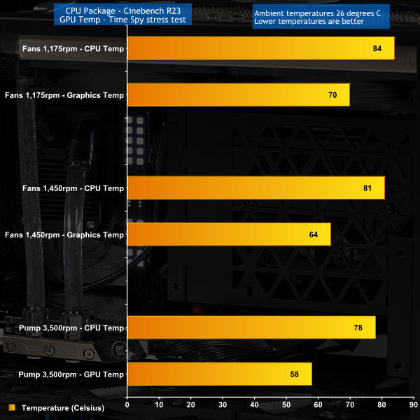 We pummelled the test system with a combination of Time Spy Stress Test and Cinebench R23 to produce a system power draw close to 600W, which was right on the limit of our SFX Corsair SF600 power supply. We used five Noctua fans in the build and were intrigued to see significant changes in temperatures after we increased fan speed and also when we increased the pump speed. These figures suggest the Jonsplus i100 Pro is working effectively and is flowing a decent amount of cooling air.