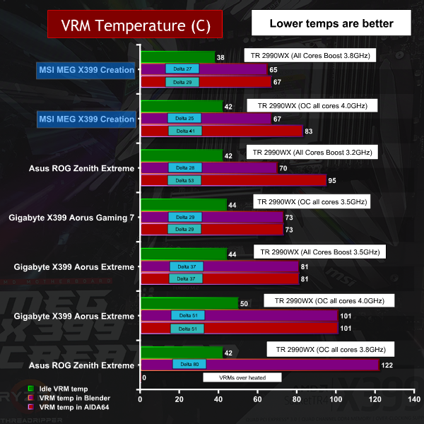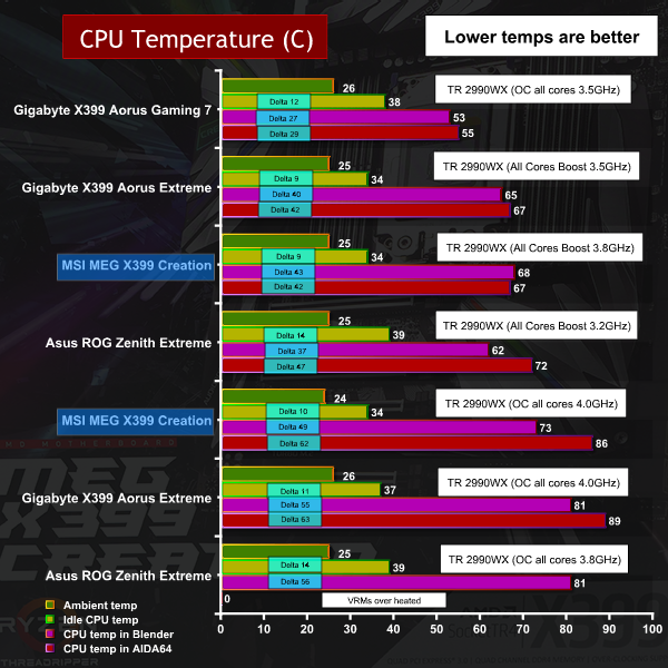 CPU temperature has a fairly direct relationship with Vcore and clock speed so it came as no surprise when we saw similar temperatures for the 2990WX overclocked to 4.0GHz on both the MSI MEG X399 Creation and Gigabyte X399 Aorus Xtreme. These two motherboards were the pick of the bunch in a group that included Gigabyte X399 Aorus Gaming 7 and Asus ROG Zenith Extreme.