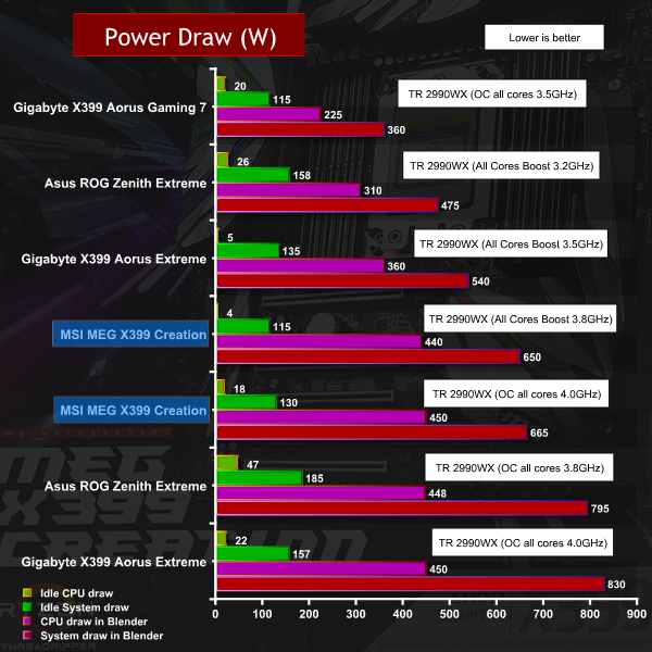 As clock speeds increase to 3.8GHz-4.0GHz the CPU power draw under load in Blender levels out at 450W. This is the point where things get interesting as some significant gaps emerge between the boards for system power draw with the MSI MEG X399 Creation drawing 650W, while the Asus ROG Zenith Extreme and Gigabyte X399 Aorus Xtreme hit the 800W mark.