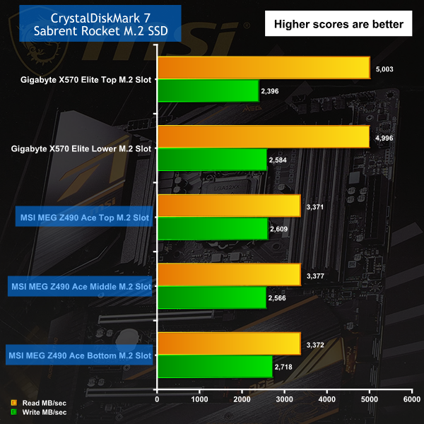 Testing the bandwidth of the M.2 slots reminds us that Intel Z490 and 10th Gen continues to use PCI Express Gen 3 while AMD X570 has moved on to Gen 4.