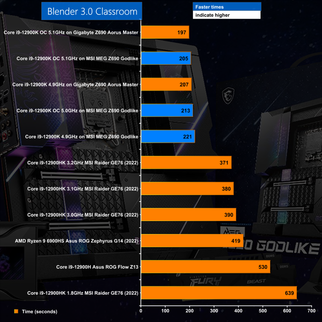 Blender is a straightforward test of CPU grunt however we saw the MSI Z690 Godlike being beaten by the Gigabyte Z690 Aorus Master despite having the Core i9 CPU running at the same clock speed.
