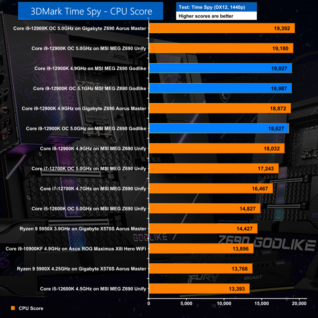 We saw a similar story in 3D Mark Time Spy as we did in Blender where the MSI MEG Z690 Godlike performed well but was beaten by other Z690 motherboards. Bizarrely, we saw the Godlike performing better on Auto than when it was overclocked.