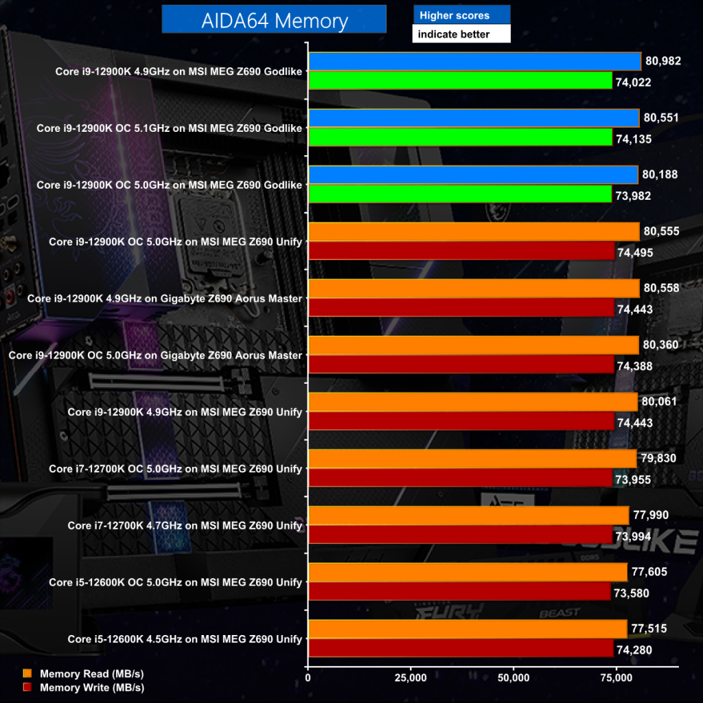 AIDA64 Memory Test gives the Godlike a clear win, albeit thanks to the bundled 32GB of Kingston Fury Beast DDR5-5200 which has a distinct advantage over the other configurations. This isn't a fair apples-to-apples however we will gladly take the win for the Godlike.