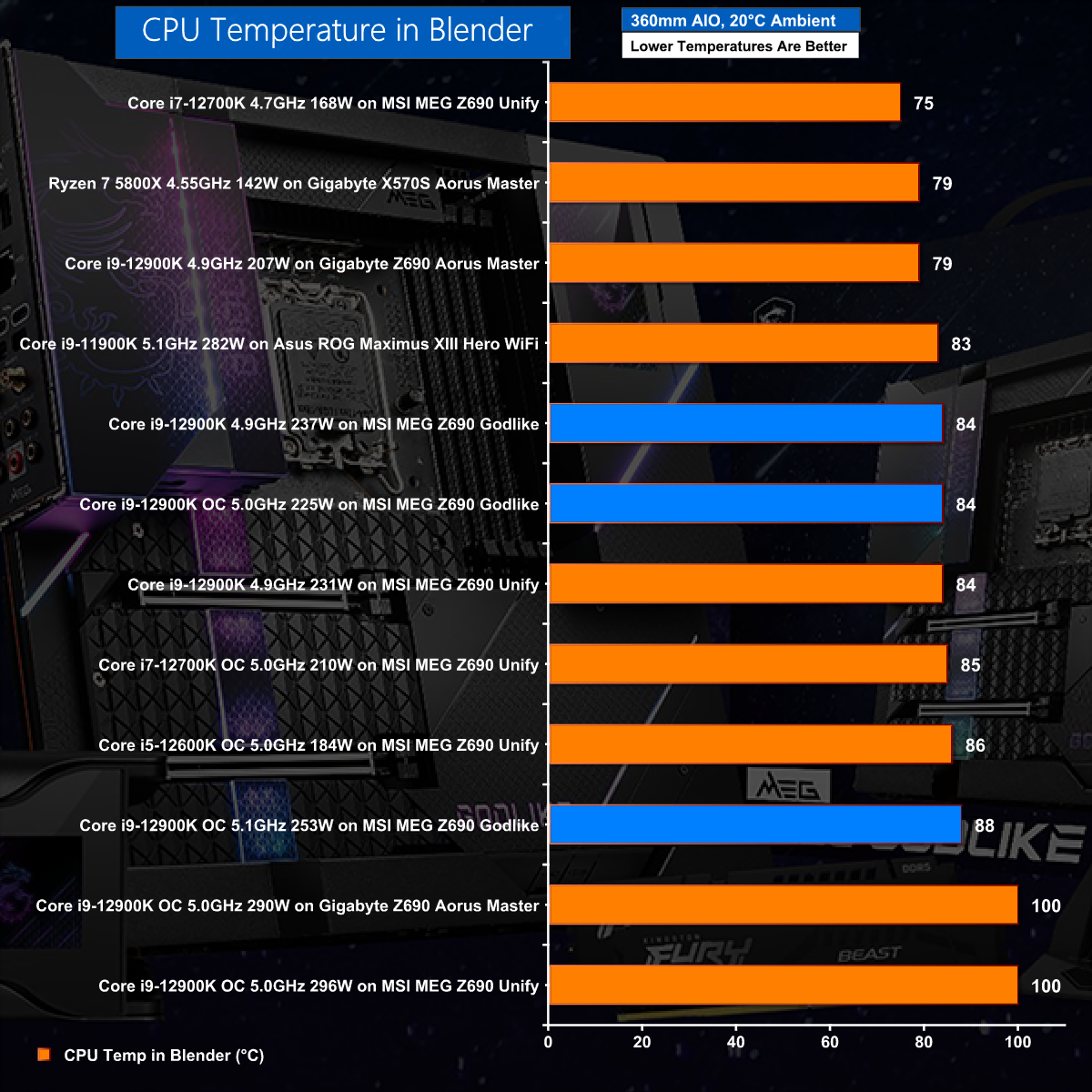 The CPU Temperature test in Blender looks excellent for the Godlike, although we are confident this is thanks to the bundled MEG CoreLiquid S360 AIO cooler rather than anything clever about the Godlike motherboard. Luke is working on a full review of the MEG CoreLiquid S360 AIO cooler and it will be fascinating to see what results he produces.