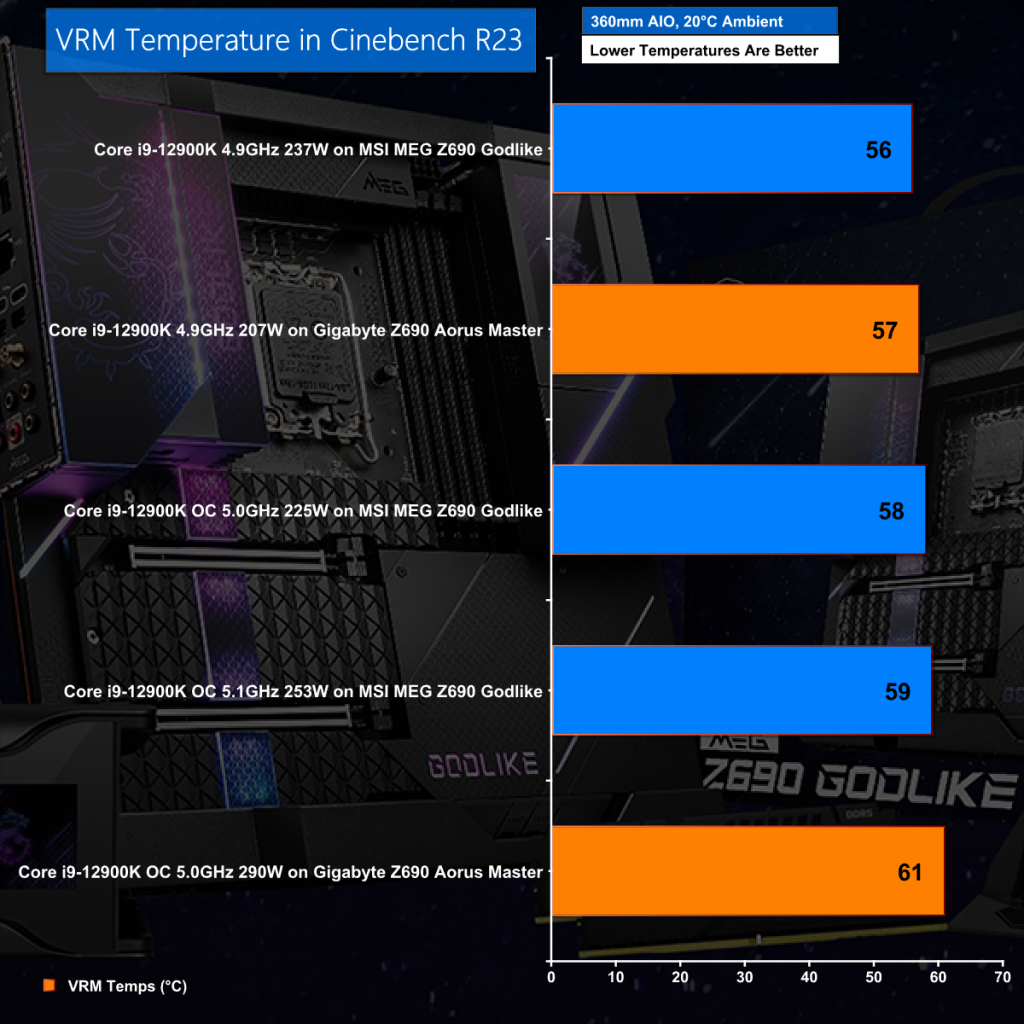 The MSI MEG Z690 Godlike has amazing VRM hardware and a superb cooling arrangement so it is no surprise to see the operating temperatures are very low. Having said that, the figures are directly comparable to the Gigabyte Z690 Aorus Master so there is clearly a limit to how far you can go with air cooling.