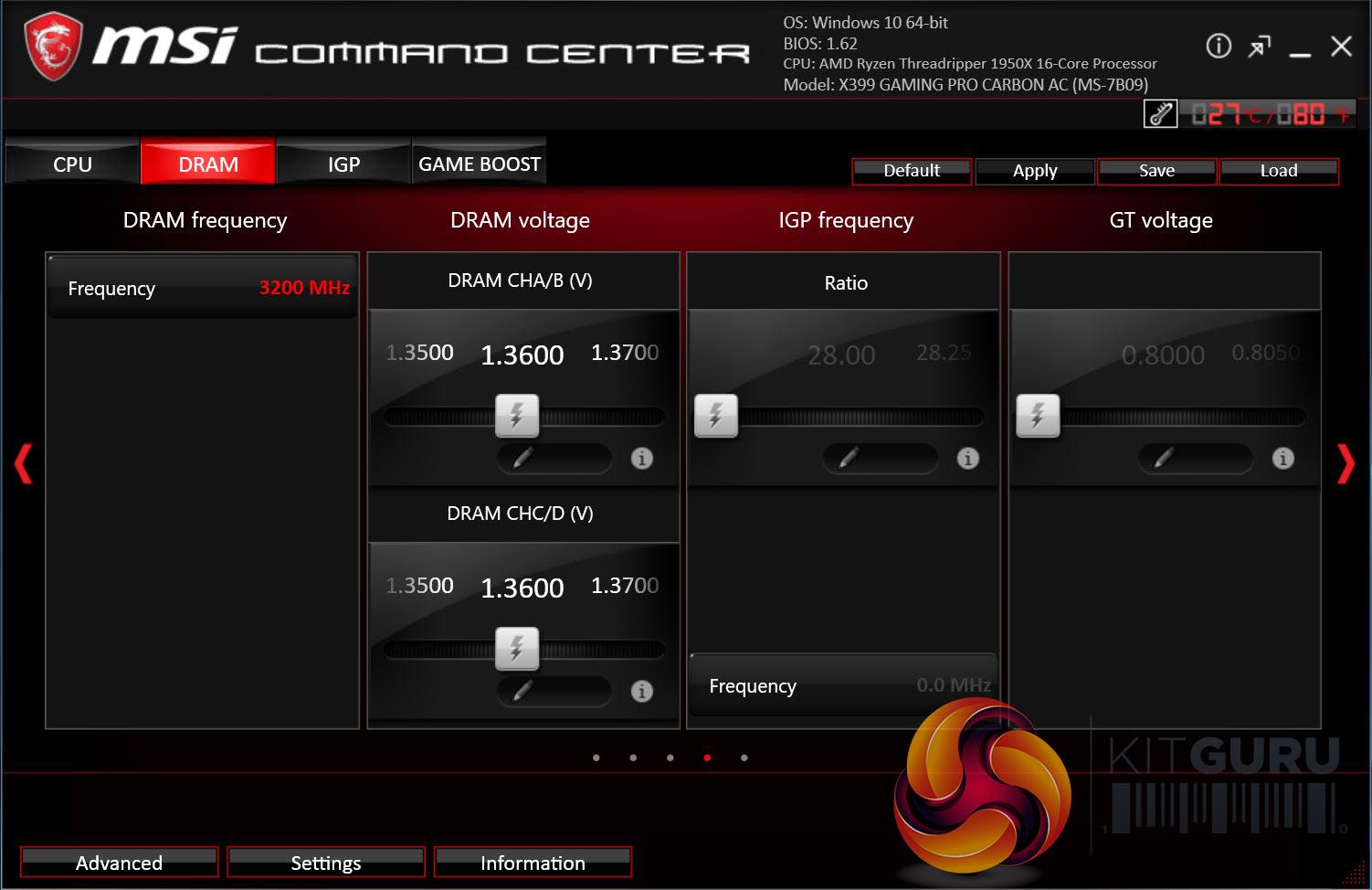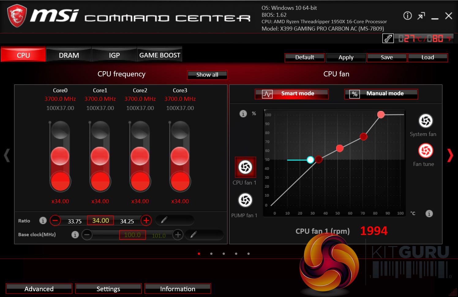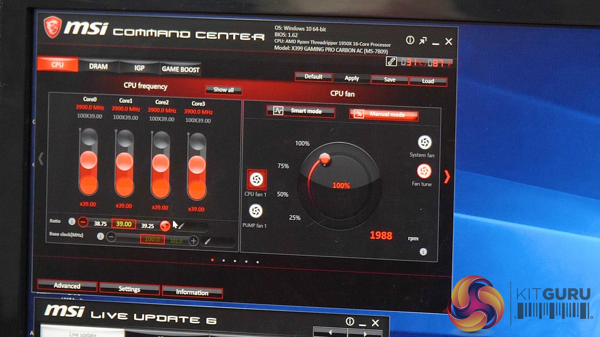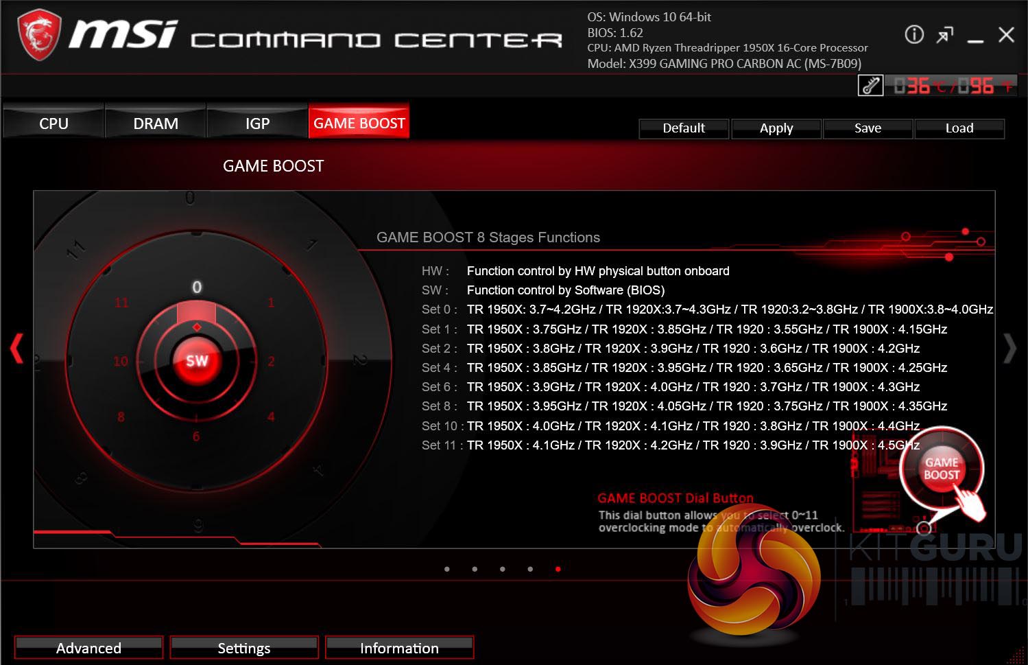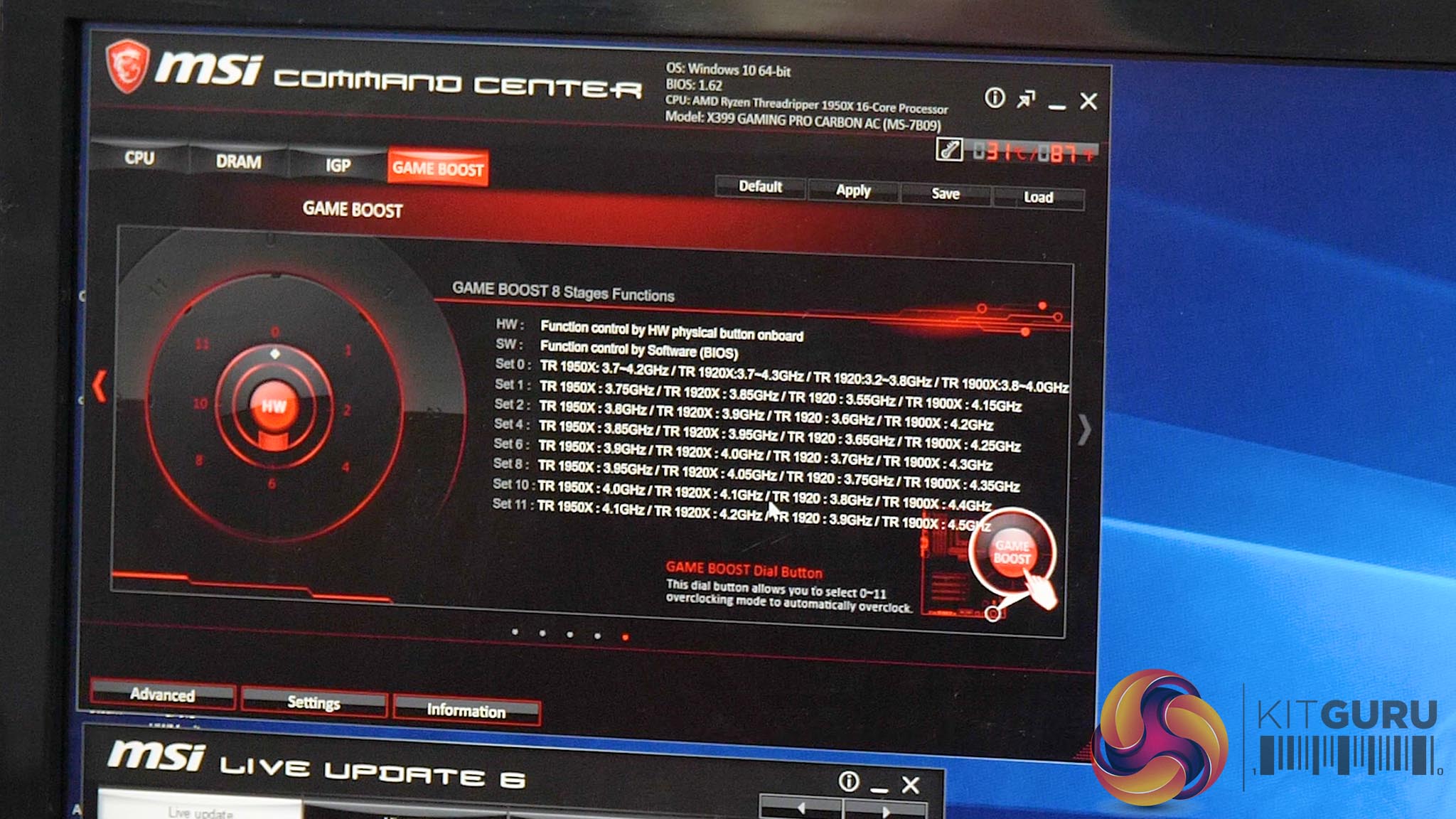 It was only once the system was running and we had installed the MSI Command Centre software that we found the Game Boost tab shows the clock speeds you can expect to see at each setting with 1950X, 1920X and 1900X CPUs.