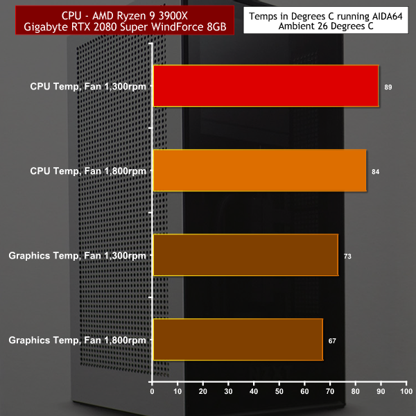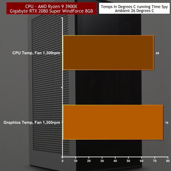 To put this chassis through its cooling paces we will be using a test system consisting of an AMD Ryzen 9 3900X CPU, Gigabyte RTX 2080 Super WindForce graphics card and an SSD. This system allows us to produce a substantial amount of heat and effectively test the NZXT H1’s cooling capabilities. For stress testing we use AIDA64 and Time Spy to create the maximum amount of load our CPU and GPU are ever likely to see.