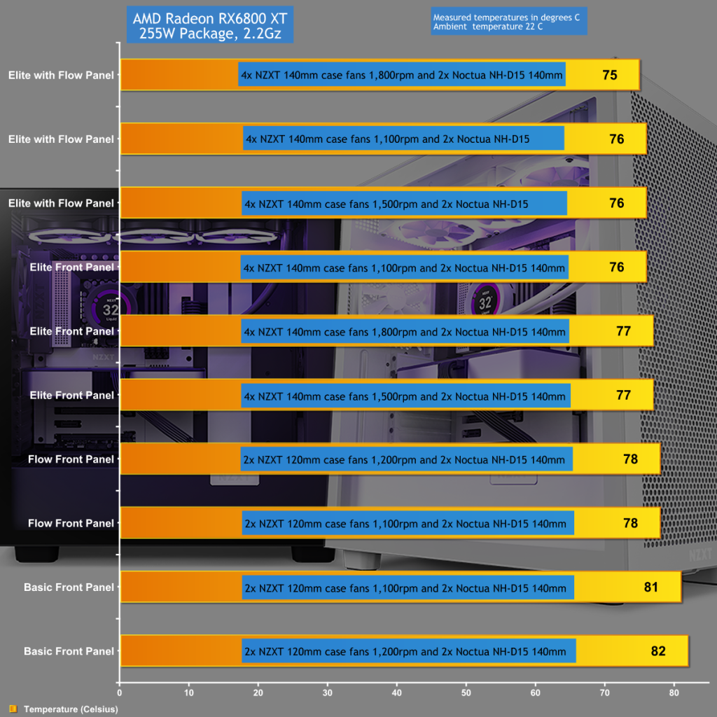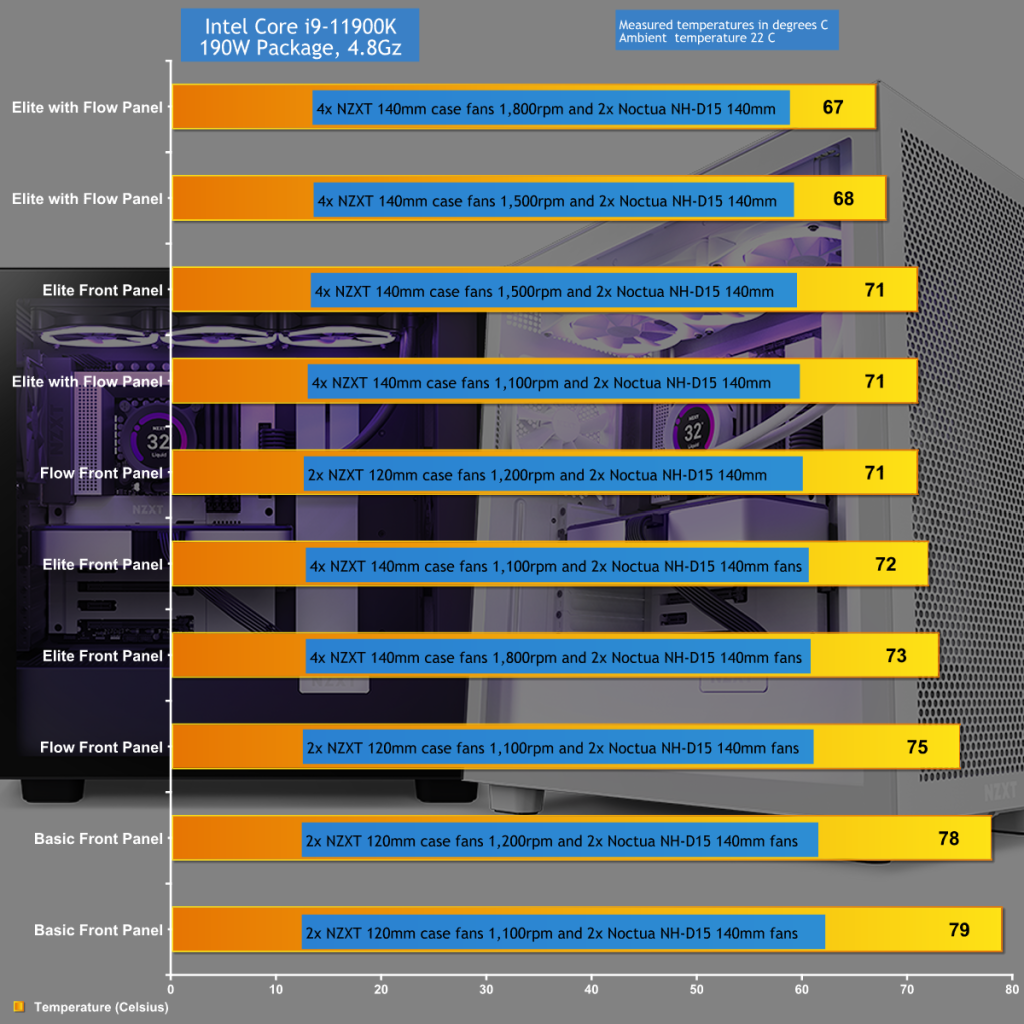 There is a ton of information in these charts and the obvious takeaway is that the Flow front panel works best when combined with the 140mm fans running at high speeds. That will come as no surprise but when you refer to our video you will hear the huge changes in noise levels and there are times when the H7 can be very noisy indeed. In other words, the H7 can work well however you will need to strike a balance between noise and cooling.