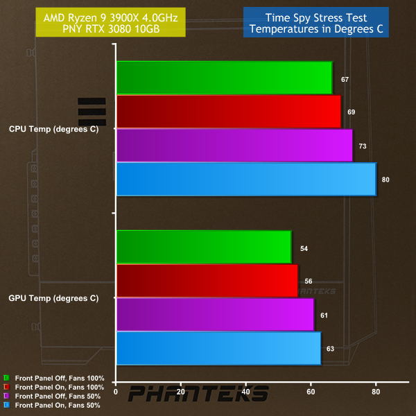 The Phanteks Eclipse P360A exceeded our expectations as we had a single 240mm radiator dealing with a combination of an RTX 3080 graphics card and Ryzen 9 3900X CPU, with a combined power draw of 475W at the wall socket. We would be perfectly happy using this case for a high end gaming PC with the front panel installed and the fans running at 50 percent.