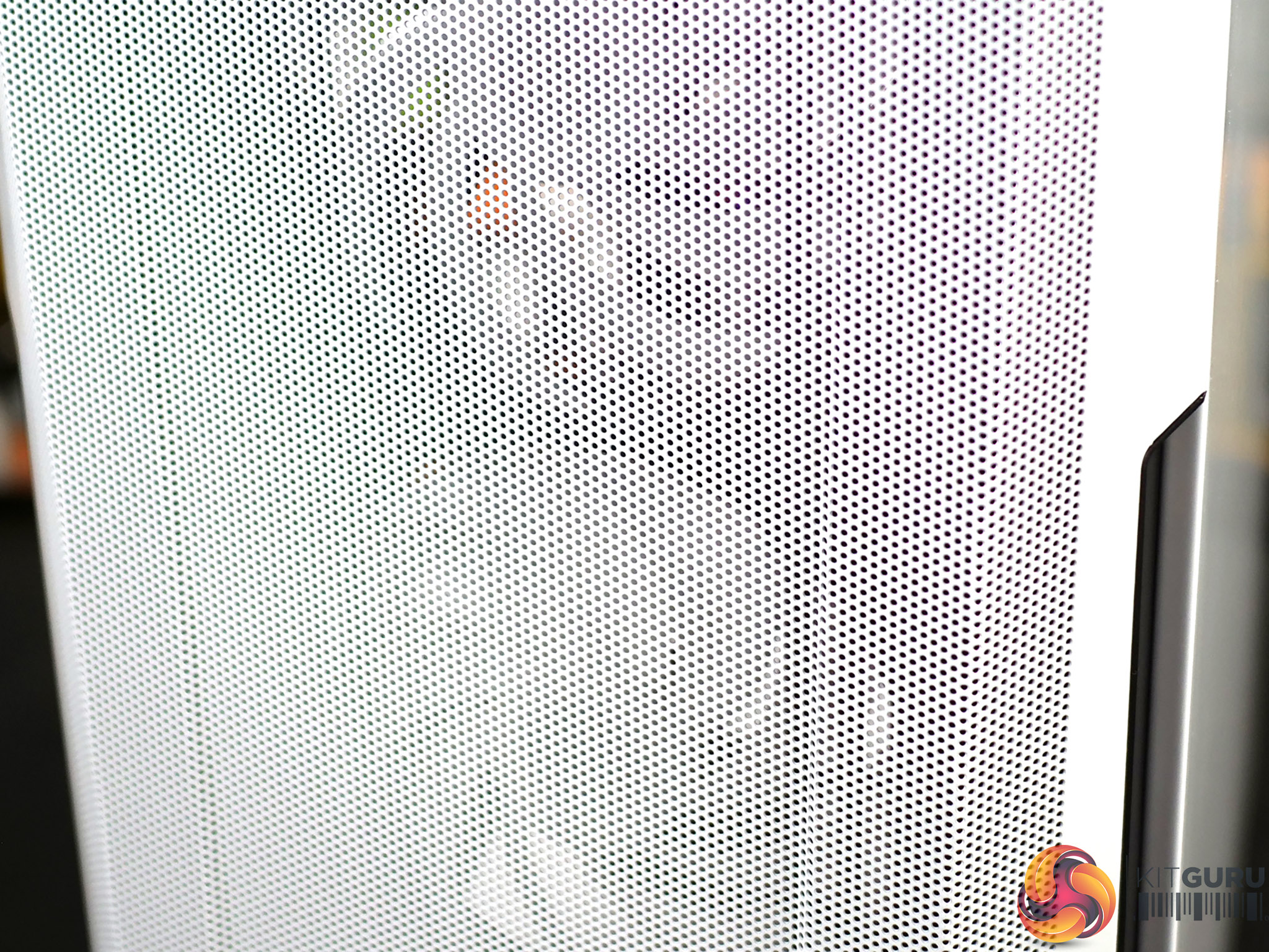 Instead with P500A we see a brand new front panel that is made from a single piece of sheet steel that is perforated with a huge number of 1mm holes. Phanteks assures us these holes allow the Performance Mesh front panel to flow air whilst also catching dust and as a result there is no separate air filter at the front of the case. Another benefit of this approach is that you can see the RGB lighting through the perforated panel so Phanteks has effectively created a Tempered Glass panel that flows air.