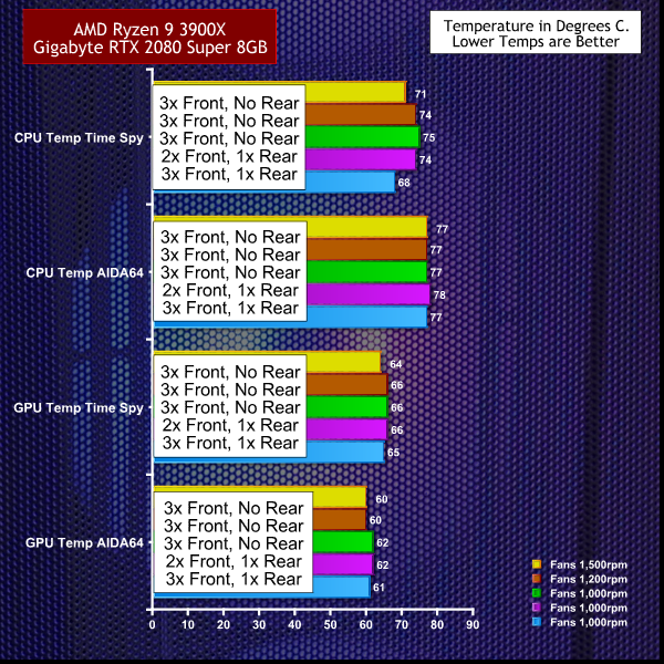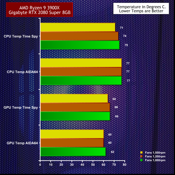 With the three front fans set to 1,000rpm we added a fourth 140mm fan at the rear of the case also set to 1,000rpm. We only observed one noticeable benefit as the CPU temperature was reduced in the Time Spy Stress test. Noise levels were unaffected. One other effect is that the extra fan gave the RGB light show a bit of a boost. The combination of a 360mm AIO cooler in the roof and either three or four 140mm fans in the case delivers superb air flow and cooling.