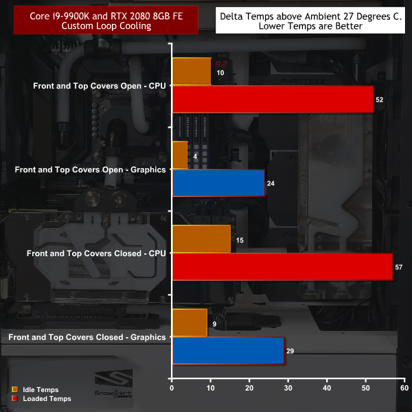 You might think our chosen 280mm radiator would be on the small side to cool both an 8-core CPU and an RTX 2080 graphics card however past experience gave us confidence it would work well. Graphics temperatures were pleasingly low, despite the hot summer conditions, and the air flow of the case clearly works effectively. It should be noted that we added two Noctua fans in the roof of the case above the radiator, so we are not testing the case in exactly the form it was supplied.