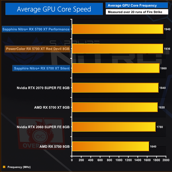 Here we present the average clock speed for each graphics card while running the 3DMark Fire Strike Ultra stress test 20 times. We use GPU-Z to record the GPU core frequency during the Fire Strike Ultra runs. We calculate the average core frequency during the entire 20-run.