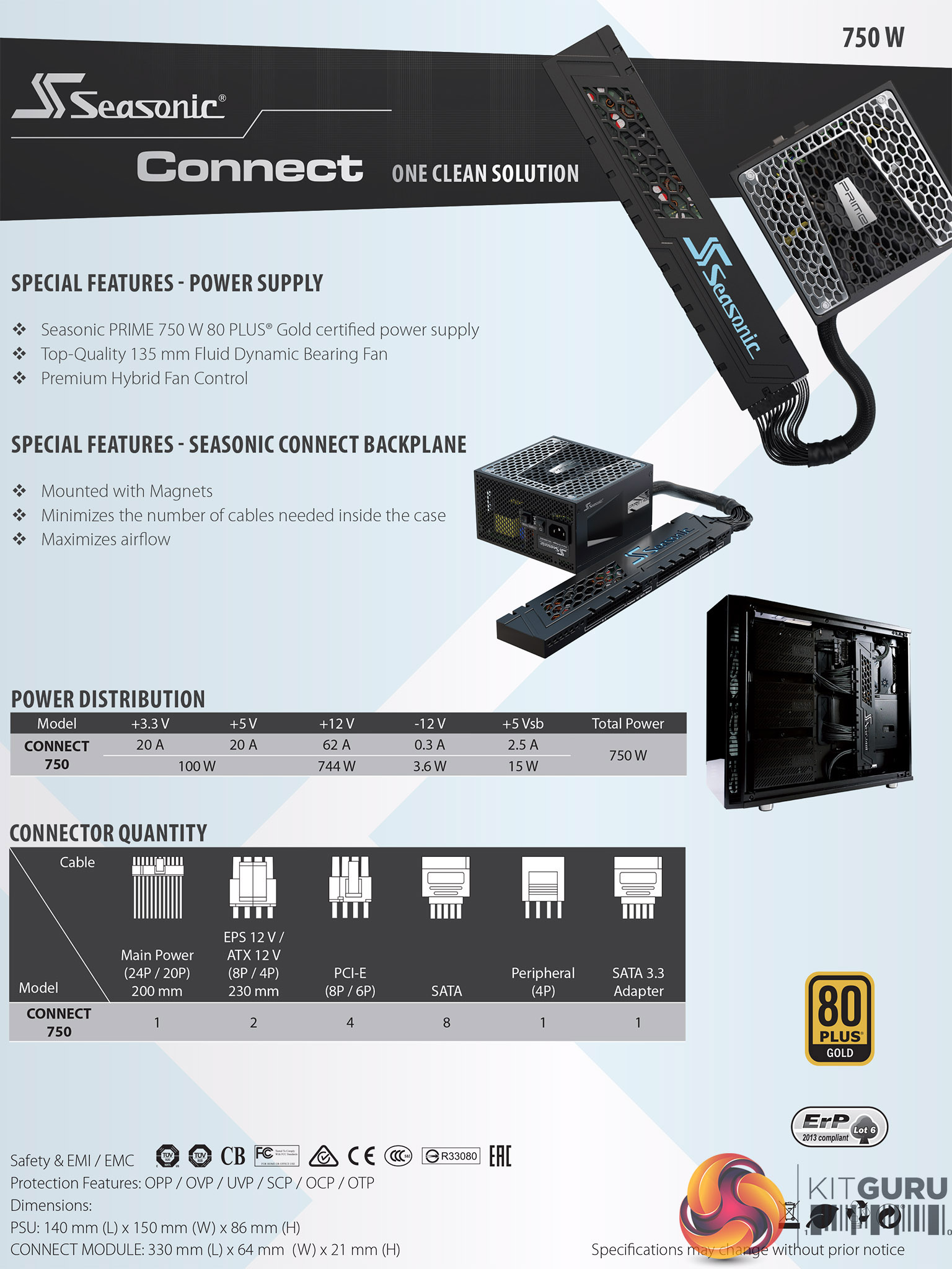 When you look at the specification of the CONNECT power supply it adds up to a conventional 750W Gold rated unit that is housed in two units. In time we hope that Seasonic will deliver other versions with different power ratings that perhaps stretch to Platinum or Titanium, but for now the CONNECT family has a single model called SSR-750FA.
