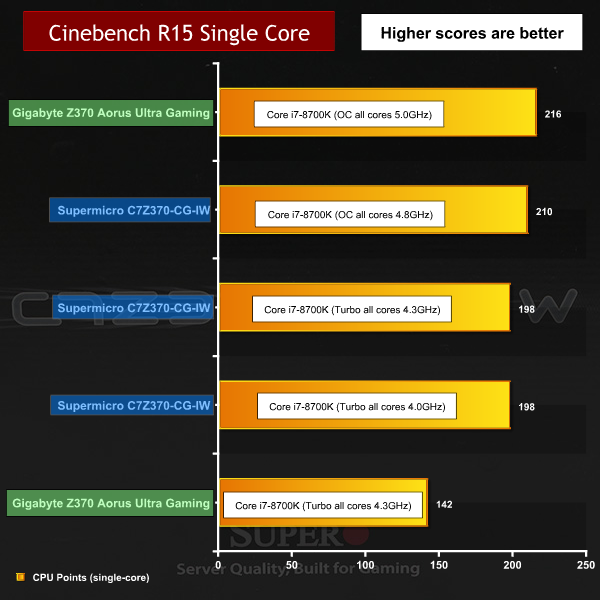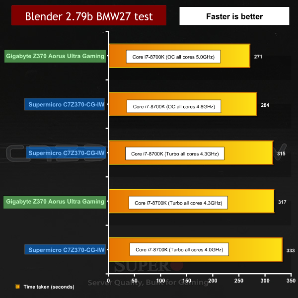As we describe above, we ran the Core i7-8700K on the SuperO board at the restricted 95W setting with a 4.0GHz Turbo speed and also with the power limit raised to allow the Turbo to run at 4.3GHz. The final setting used the overclocked 4.8GHz profile in the BIOS.