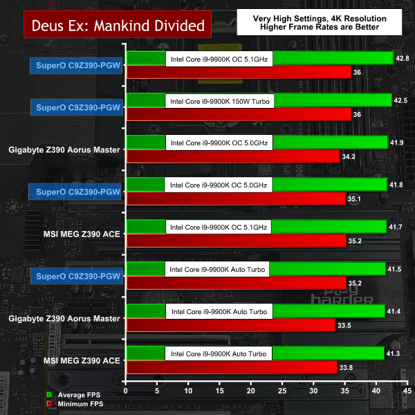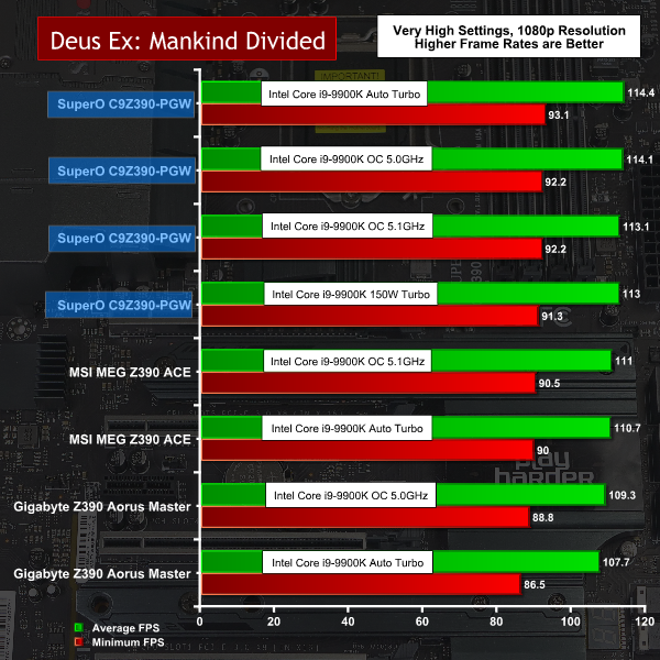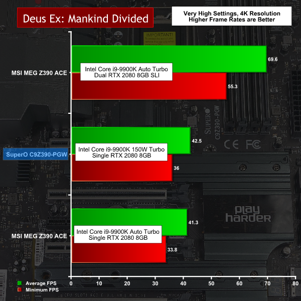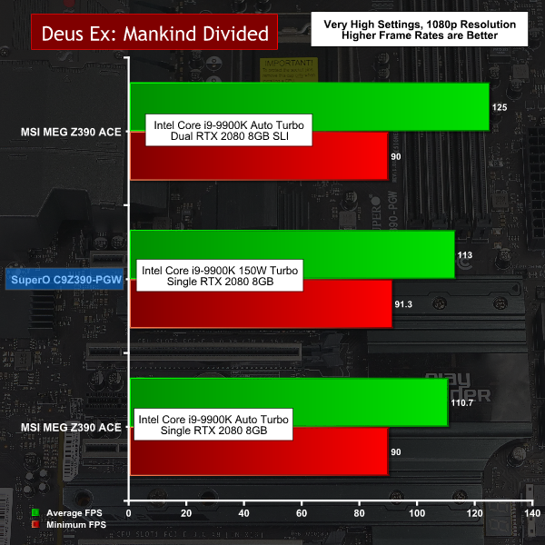 In our Deus Ex tests at 1080p and 4K the SuperO delivers good result, although the spread of frame rates is fairly narrow. We have included some test results with dual RTX 2080 graphics in SLI on the MSI MEG Z390 ACE motherboard to show the potential performance gains that SuperO might unlock were they paid up to use the Nvidia technology.