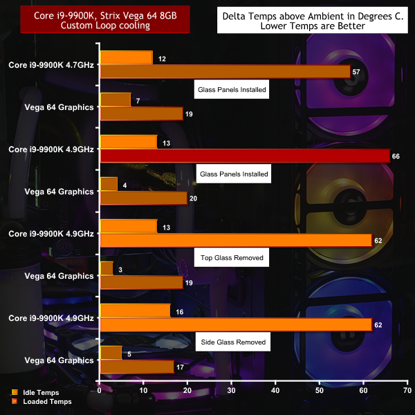 We tested cooling with our Core i9-9900K running at stock 4.7GHz and then overclocked to 4.9GHz. Our main interest was to see whether the glass panels restricted air flow as they appear to block the fans entirely and we all know that air cannot flow through glass. To our very pleasant surprise, removing the top and side glass made very little difference to thermals.