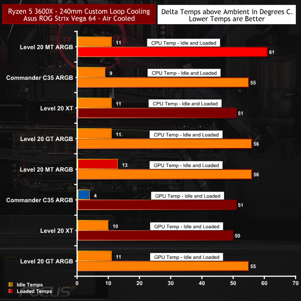 The best performance in this round-up comes from the Commander C35 which was exactly what we expected thanks to the combination of two 200mm fans and a mesh front panel. By contrast the Level 20 MT and GT models both suffered as the extensive glass panels and sealed front panel choked the fans. The Level 20 XT performed better than we expected as the huge volume of the case allowed enough air to move around and keep our hardware under control.