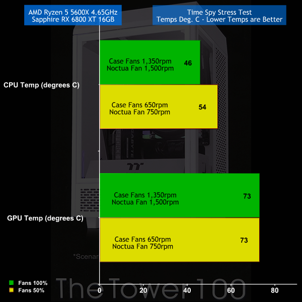 The ambient temperature during our testing was a mere 15 degrees Celsius so you should add five or six degrees to our figures to get representative temperatures however the takeaway is that The Tower 100 is absolutely fine. Our Sapphire RX 6800 XT was effectively breathing fresh air and was completely happy, and it was clear the Noctua NH-U12S had no difficulty cooling our Ryzen 5 5600X.