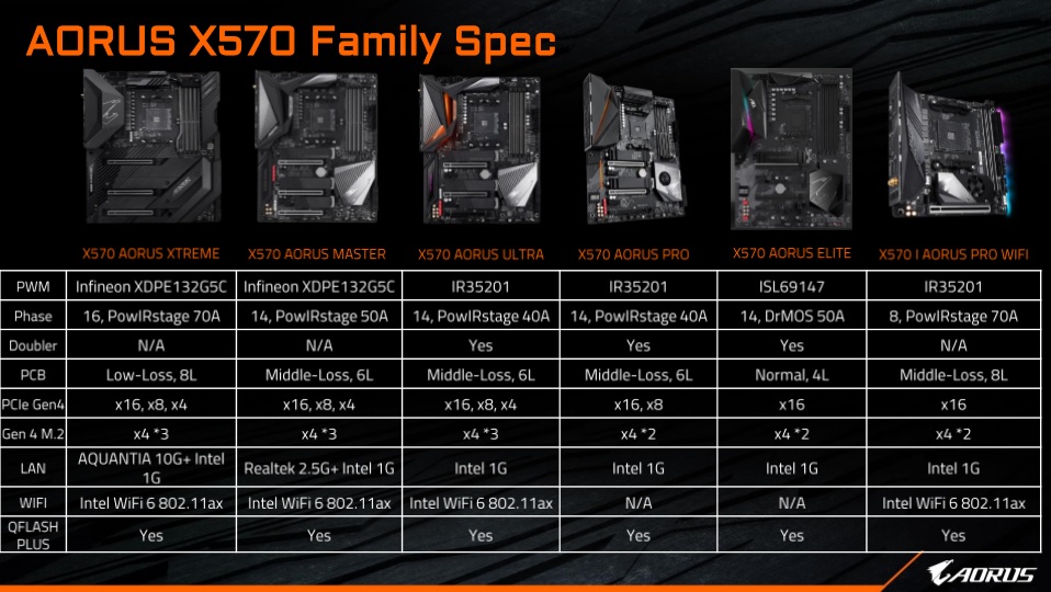 We gave an overview of the X570 lineup yesterday, with the AORUS XTREME sitting at the very top of the pile. This particular board has an 8-layer PCB, which has also paved the way for all connectors to be mounted on the side of the board, making cable management a breeze. It is likely going to be very expensive though, an exact price has yet to be confirmed but we are guessing somewhere in the $500 to $600 range. The AORUS Master is one step down and uses a 6-layer PCB instead, which means traditional top-mounted connectors. Other than that, the spec is similar to the XTREME, with the main differences being 14-phase power instead of 16-phase and the omission of Aquantia 10G LAN.